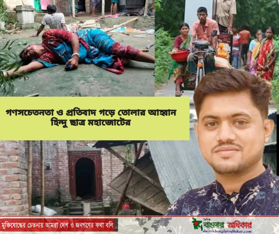 সম্প্রতি দেশের বিভিন্ন স্থানে সংখ্যালঘু সম্প্রদায়ের উপর চলমান সহিংসতা, হামলা ও নিপীড়নের ঘটনায় গভীর উদ্বেগ ও ক্ষোভ প্রকাশ করেছে বাংলাদেশ জাতীয় হিন্দু ছাত্র মহাজোট। সংগঠনের কেন্দ্রীয় কমিটির সাধারণ সম্পাদক – রাজীব চন্দ্র সাহা এক বিবৃতিতে বলেন, “ধর্ম অবমাননার মিথ্যা অজুহাতে বারবার আমাদের সংখ্যালঘু ভাইবোনদের উপর যে নির্মম আঘাত হানা হচ্ছে, তা শুধু তাদের উপর নয়, গোটা মানবতার উপর আঘাত।”