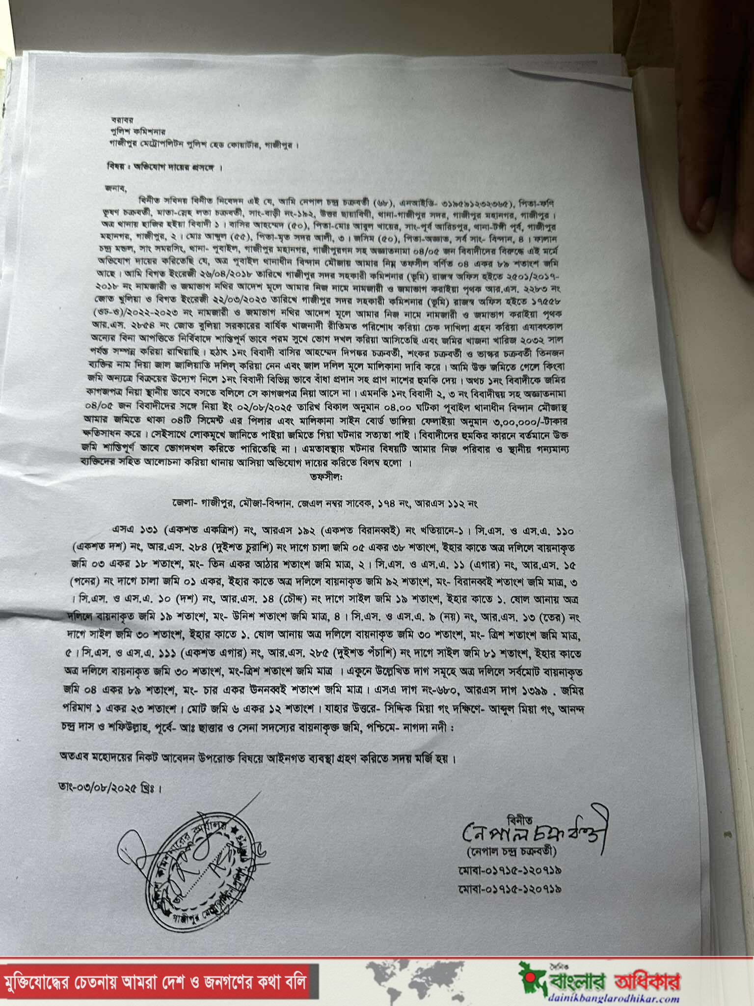 জমি দখল, ভাঙচুর ও প্রাণনাশের হুমকির অভিযোগ তুলে পুলিশের শরণাপন্ন প্রবীণ নাগরিক গাজীপুর মহানগরের পূবাইল থানাধীন বিন্দান মৌজায় নিজের মালিকানাধীন ৬ একরেরও বেশি জমিতে জাল দলিল তৈরি করে দখলের চেষ্টা, ভাঙচুর এবং প্রাণনাশের হুমকির অভিযোগ তুলে পুলিশের কাছে লিখিত অভিযোগ করেছেন ৬৮ বছর বয়সী প্রবীণ নাগরিক নেপাল চন্দ্র চক্রবর্তী।