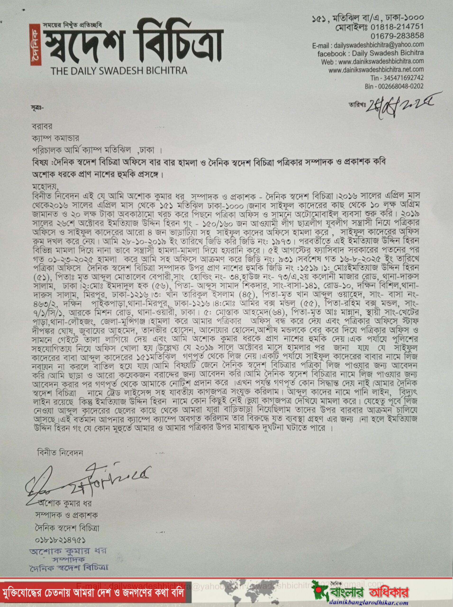 দৈনিক স্বদেশ বিচিত্রা পত্রিকার সম্পাদক ও প্রকাশক কবি অশোক ধরের বিরুদ্ধে মিথ্যা মামলা দিয়ে হয়রানি ও বারবার প্রাণ নাশের চেষ্টা ভূমিদুস্য ইমতিয়াজ উদ্দিন হিরনের।