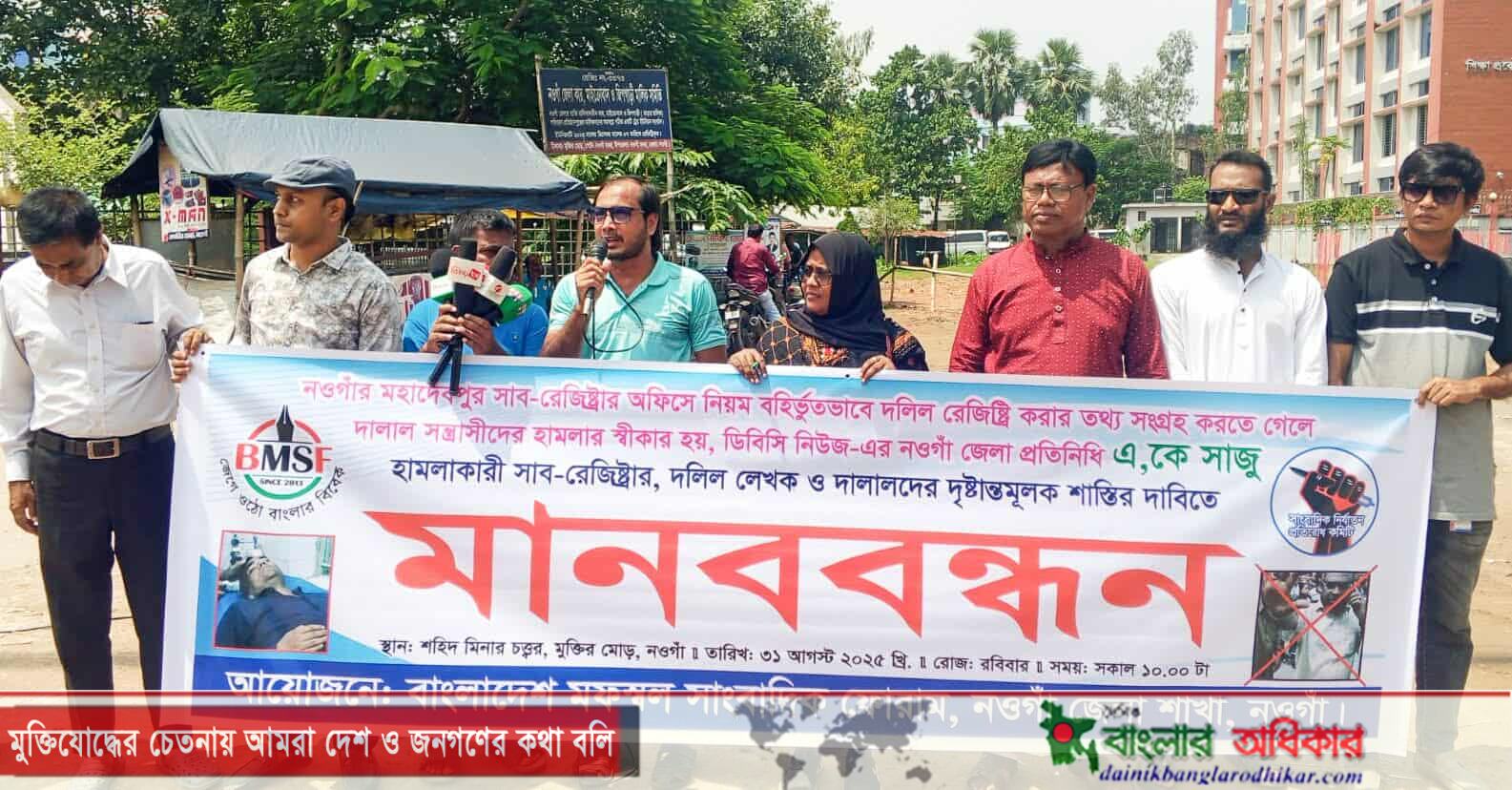 নওগাঁর মহাদেবপুর সাব-রেজিস্ট্রি অফিসে তথ্য সংগ্রহ করতে গিয়ে ডিবিসি নিউজের নওগাঁ জেলা প্রতিনিধি সাংবাদিক এ. কে. সাজুর ওপর সন্ত্রাসী হামলার প্রতিবাদে নওগাঁয় মানববন্ধন ও বিক্ষোভ সমাবেশ অনুষ্ঠিত হয়েছে।