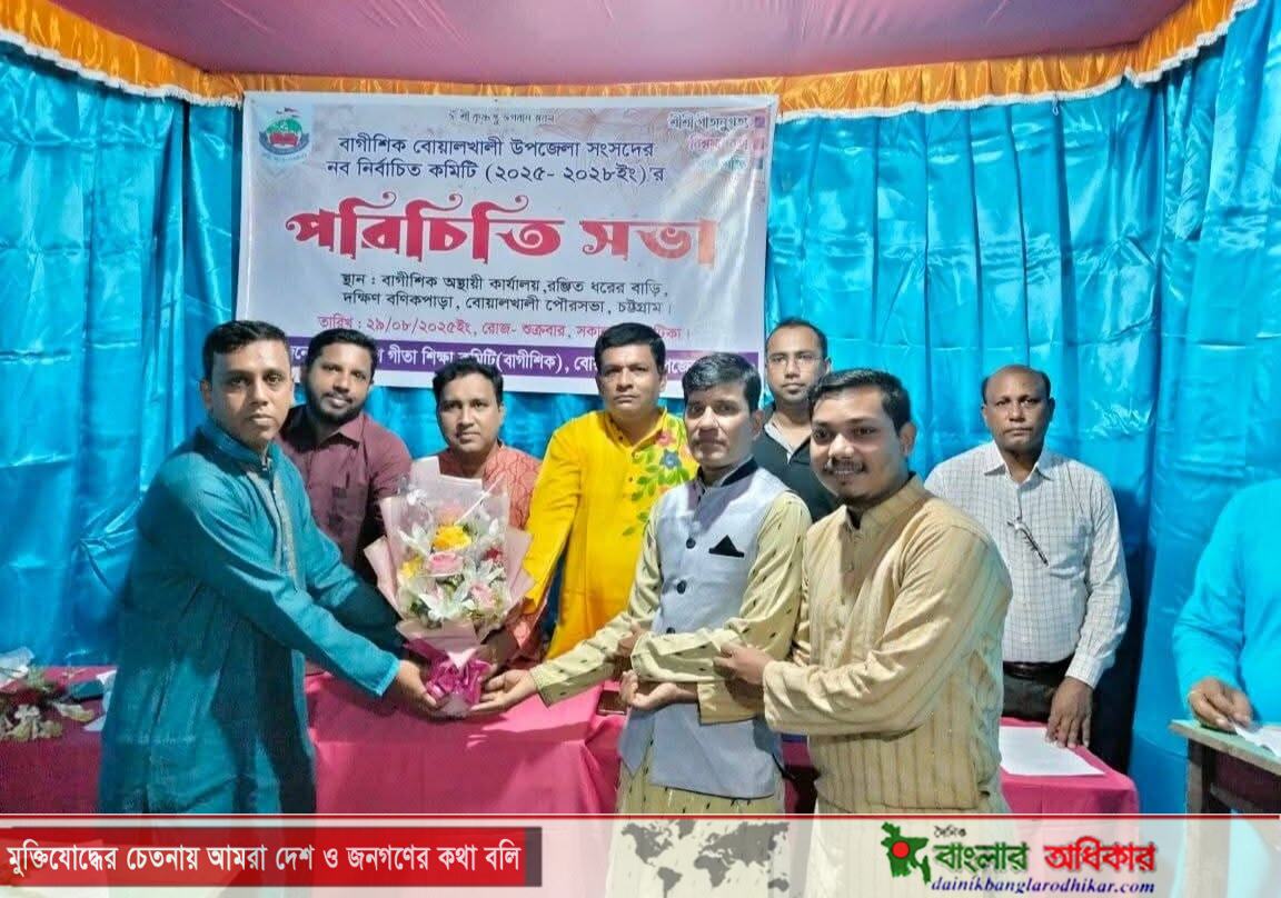 গত ২৯/০৮/২০২৫ ইং রোজ শুক্রবার পূর্ব গোমদন্ডীস্থ বাগীশিক বোয়ালখালী উপজেলা সংসদের অস্থায়ী কার্যালয়ে নব নির্বাচিত কার্যকরী কমিটি (২০২৫- ২০২৮ইং) এর এক পরিচিতি ও মত বিনিময় সভা অনুষ্ঠিত হয়।বাগীশিক বোয়ালখালী উপজেলা সংসদের নব নির্বাচিত কমিটির