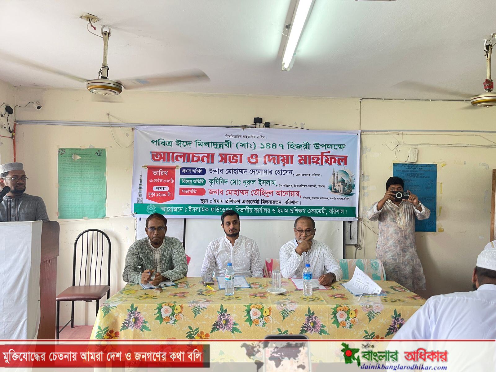 বরিশাল আজ এয়ারপোর্ট থানাধীন কাশিপুর ইমাম প্রশিক্ষন কেন্দ্রে ইসলামিক ফাউন্ডেশন, বিভাগীয় কার্যালয় ও ইমাম প্রশিক্ষণ একাডেমী, বরিশাল এর উদ্যোগে পবিত্র ঈদে মিলাদুন্নবি (সঃ) উপলক্ষে আলোচনা সভা ও দোয়া মাহফিল অনুষ্টিত হয়। উক্ত দোয়া মাহফিলে সভাপতিত্ব করেন জনাব মোহাম্মদ তৌহিদুল আনোয়ার, পরিচালক ইসলামিক ফাউন্ডেশন বিভাগীয় কার্যলয়, বরিশাল। এছাড়াও প্রধান অতিথি হিসেবে উপস্থিত ছিলেন জনাব মোহাম্মদ দেলোয়ার হোসেন, জেলা প্রশাসক বরিশাল।বিশেষ অতিথি হিসেবে উপস্থিত ছিলেন কৃষিবিদ মোঃ নুরুল ইসলাম, উপ পরিচালক ইমাম প্রশিক্ষণ একাডেমী বরিশাল। এছাড়াও অত্র প্রতিষ্ঠানের বিভিন্ন পর্যায়ের লোকজন উপস্থিত ছিলেন।এসময়ে বিভিন্ন বিষয়ের উপর আলোকপাত করা হয়।এছারা দেশের সার্বিক দিক নিয়ে জানানো হয় দেশকে রক্ষা করতে দেশের সবাইকে এক হয়ে কাজ করার আহবান জানায়।বক্তব্য শেষে প্রশিক্ষন কর্মসূচি চলমান রাখে। বেলা ২.৩০ মিনিটের পর প্রশিক্ষন শেষে, আলোচনা সভার সমাপ্তি ঘোষনা করেন।