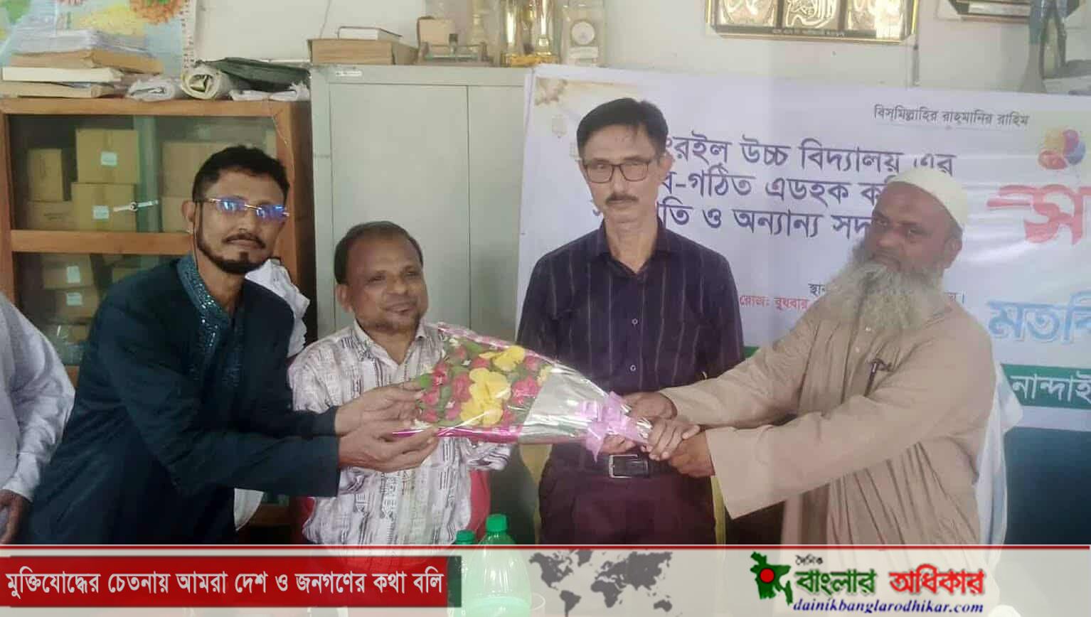 নান্দাইল (ময়মনসিংহ) প্রতিনিধি : ময়মনসিংহের নান্দাইল উপজেলার সিংরইল উচ্চ বিদ্যালয়ের নবগঠিত এডহক কমিটির সভাপতি মোঃ জিয়া উদ্দিন খান টিপু সহ অন্যান্য সদস্য ও এনটিআরসি কর্তৃক নতুন নিয়োগ প্রাপ্ত ৪জন শিক্ষককে বুধবার ( ১০ সেপ্টেম্বর) আনুষ্ঠানিক ভাবে বরণ ও সংবর্ধনা প্রদান করা হয়। নবনির্বাচিত সভাপতি মোঃ জিয়া উদ্দিন খান টিপুর সভাপতিত্বে অনুষ্ঠিত সংবর্ধনা সভায় বিশিষ্ট শিক্ষানুরাগী সিনিয়র সাংবাদিক মোঃ এনামুল হক বাবুল সভায় বিশেষ অতিথি হিসাবে উপস্থিত ছিলেন। বই পড়া আন্দোলনের সাধারণ সম্পাদক ফাইজুল ইসলামের সঞ্চালনায় অনুষ্ঠিত সংবর্ধনা সভায় বক্তব্য রাখেন বিদ্যালয়ের ভারপ্রাপ্ত প্রধান শিক্ষক মোঃ মোশারফ হোসেন বিএনপি নেতা আমিনুল ইসলাম রতন, কবীর উদ্দিন ভূইঁয়া, সরকারী প্রাথমিক বিদ্যালয়ের প্রধান শিক্ষক মোঃ হাফিজ উদ্দিন, সমাজ সেবক মোঃ কায়সার, সাংবাদিক আতাউর রহমান বাচ্চু, শিক্ষক প্রতিনিধি মিলন আরা বেগম, অভিভাবক মোঃ সাইদুল ইসলাম, সাংবাদিক ফরিদ মিয়া প্রমুখ। অনুষ্ঠানের শুরুতে নতুন কমিটির সভাপতি জিয়া উদ্দিন খান টিপু, অন্যান্য সদস্য ও অতিথি সাংবাদিক এনামুল হক বাবুলকে ফুলের তোড়া দিয়ে বরণ করা হয়। অনুষ্ঠানে আলোর ভুবন পাঠাগারের পক্ষ থেকে ২০জন ছাত্র/ছাত্রীকে নিয়মিত বিদ্যালয়ে উপস্থিতির জন্য বই উপহার প্রদান করা হয়। দ্বিতীয় পর্বে প্রধান শিক্ষক (ভারপ্রাপ্ত) মোশারফ হোসেনের পরিচালনায় ম্যানেজিং কমিটির প্রথম সভা অনুষ্ঠিত হয়। অনুষ্ঠানে সকল বক্তারা অত্র বিদ্যালয়ের জন্য একটি ৪তলা ভবন নির্মানের জোরদাবী জানান।