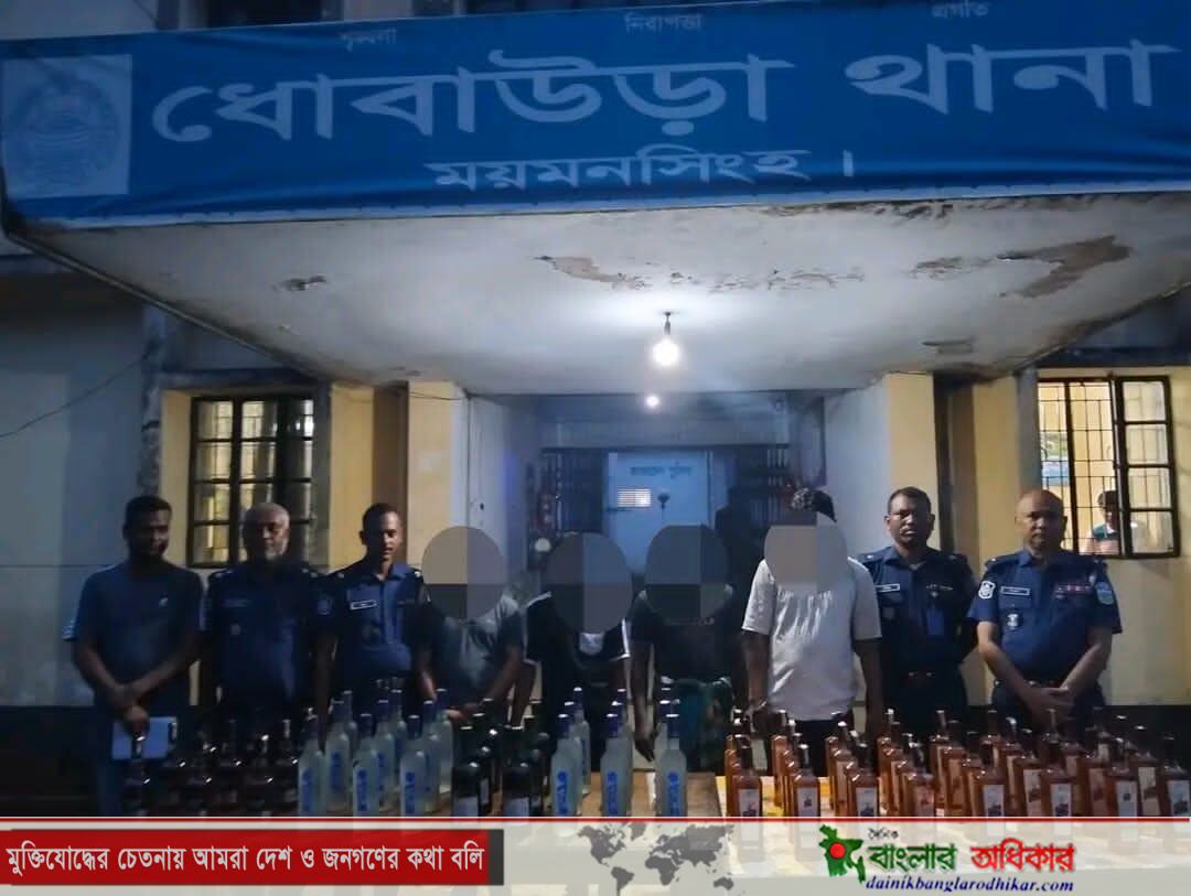 ময়মনসিংহ জেলার সুযোগ্য পুলিশ সুপার ও সহকারী পুলিশ সুপার হালুয়াঘাট সার্কেলের সার্বিক দিক নির্দেশনায় ১১সেপ্টেম্বর বৃহস্পতিবার ০৫.১০ অফিসার ইনচার্জ ঘটিকার মোঃ আল-মামুন সরকার এর নেতৃত্বে সঙ্গীয় অফিসার ফোর্স সহ ধোবাউড়া থানা পুলিশ বিশেষ অভিযান পরিচালনা করাকালে পুলিশ পরিদর্শক (তদন্ত) মোঃ মোজাম্মেল হক, কিলো-১২ ডিউটিতে নিয়োজিত এসআই(নিরস্ত্র)/আনোয়ার হোসেন, বাজার-১২ ডিউটিতে নিয়োজিত, এএসআই(নিঃ) শরীফ হোসেন সঙ্গীয় ফোর্স সহ ধোবাউড়া থানাধীন ধাইরপাড়া সাকিনস্থ পানির ট্যাংকির পার্শ্বে কলসিন্দুর টু ধোবাউড়া পাকা রাস্তার উপর থেকে ৬৫ বোতল ভারতীয় মদ যার মোট মূল্য-২৬৪,০০০/-(দুইলক্ষ চৌষট্টি হাজার) টাকা, ০২ টি প্রাইভেট কার যার মূল্য অনুমান ৩০,০০,০০০/- টাকা সহ ০৪ জন আসামী ১। আলামিন (৩২), ২। রুবেল (৩৪), ৩। মোঃ সাইফুল (২২), ৪। মোঃ হাবিকুল ইসলাম (৩৫) দেরকে গ্রেফতার করা হয় । জব্দকৃত আলামত সর্বমোট মূল্য-৩২,৬৪০০০/- টাকা । উক্ত বিষয়ে আইনগত ব্যবস্থা প্রক্রিয়াধীন।