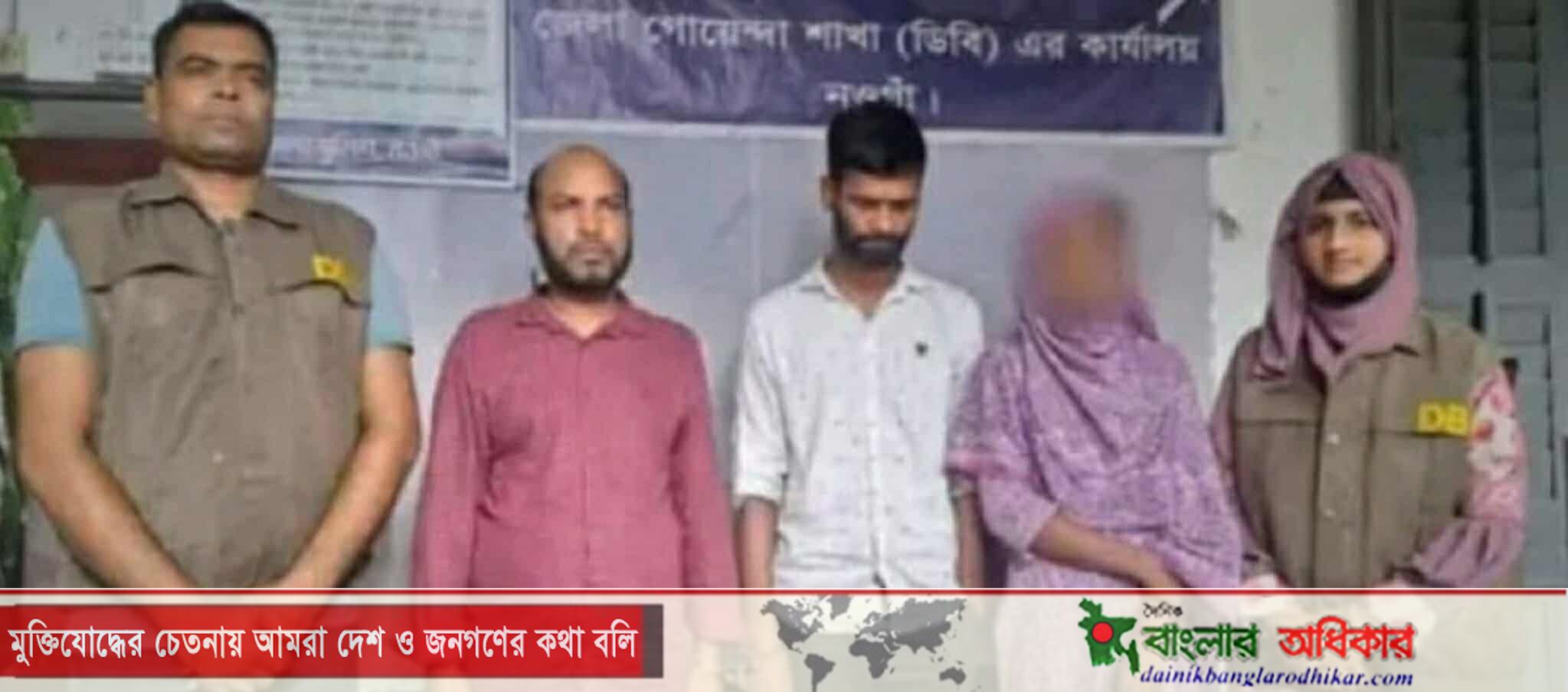 গ্রেপ্তারকৃতরা হলো, বগুড়ার সান্তাহার পৌরসভার কলসা হলুদ ঘর এলাকার চুন্নু মিয়ার ছেলে রুবেল হোসেন (৩৪)। তিনি সান্তাহার পৌর স্বেচ্ছাসেবক দলের সিনিয়র সহ-সভাপতি। এবং ইয়ার্ড কলোনির মৃত রফিকুল ইসলাম ভোলার মেয়ে সোনিয়া ওরফে সনি (২৫) ও মৃত রফিকউল্লাহ’র ছেলে মোমিনুল ইসলাম সোহাগ (৪৩)। তার স্থায়ী বাড়ি নোয়াখালীর মুরাদপুরে আর বর্তমানে নারায়ণগঞ্জের সিদ্ধিরগঞ্জ গ্রামে।