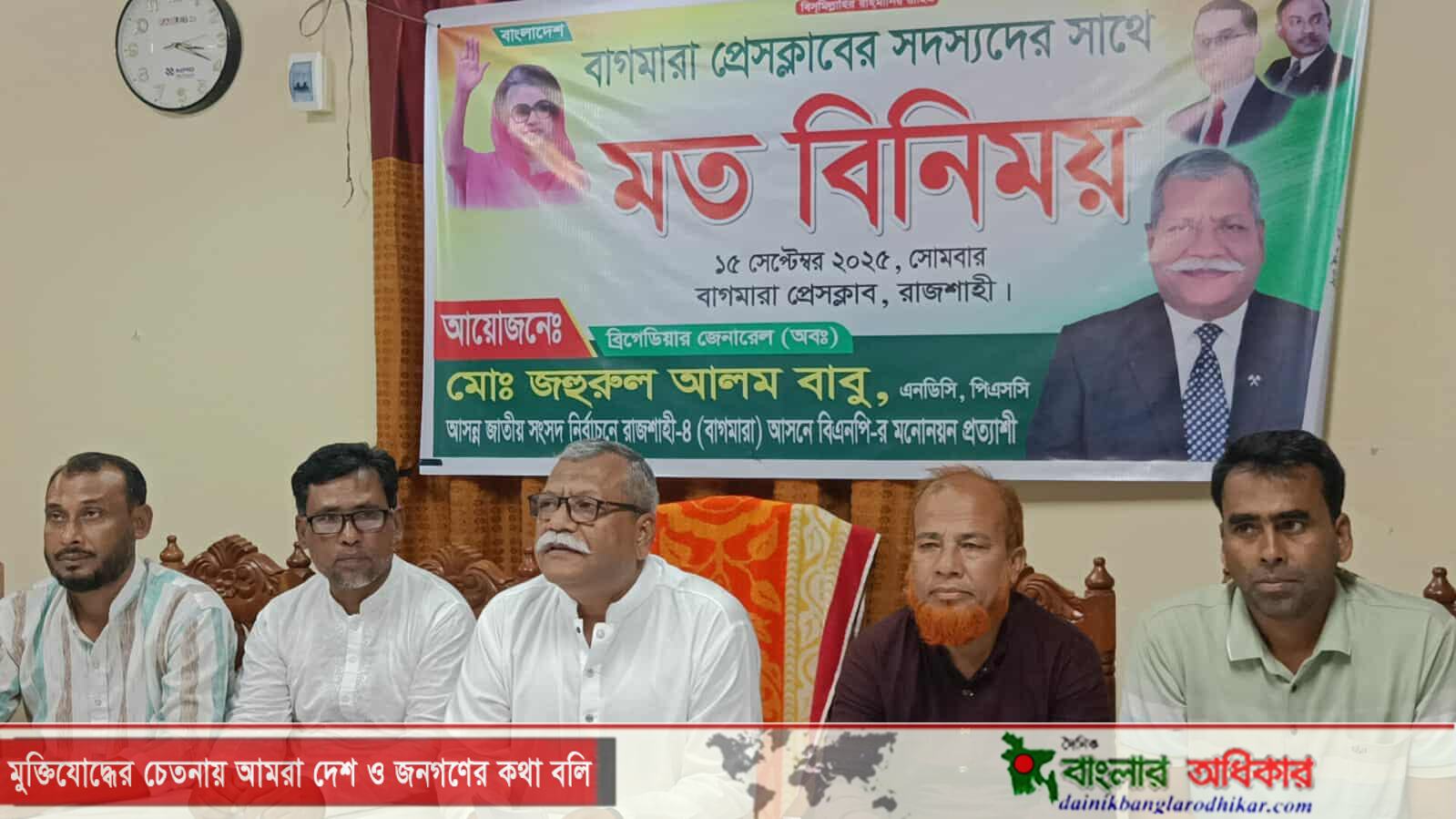 রাজশাহী-৪ (বাগমারা) আসনের বাংলাদেশ জাতীয়তাবাদী দল (বিএনপি) থেকে আসন্ন জাতীয় সংসদ নির্বাচনে মনোনয়ন প্রত্যাশী ব্রিগেডিয়ার জেনারেল (অব.) জহুরুল আলম বাবু বাগমারা প্রেসক্লাবে স্থানীয় সাংবাদিকদের সাথে মতবিনিময় সভা করেছেন।