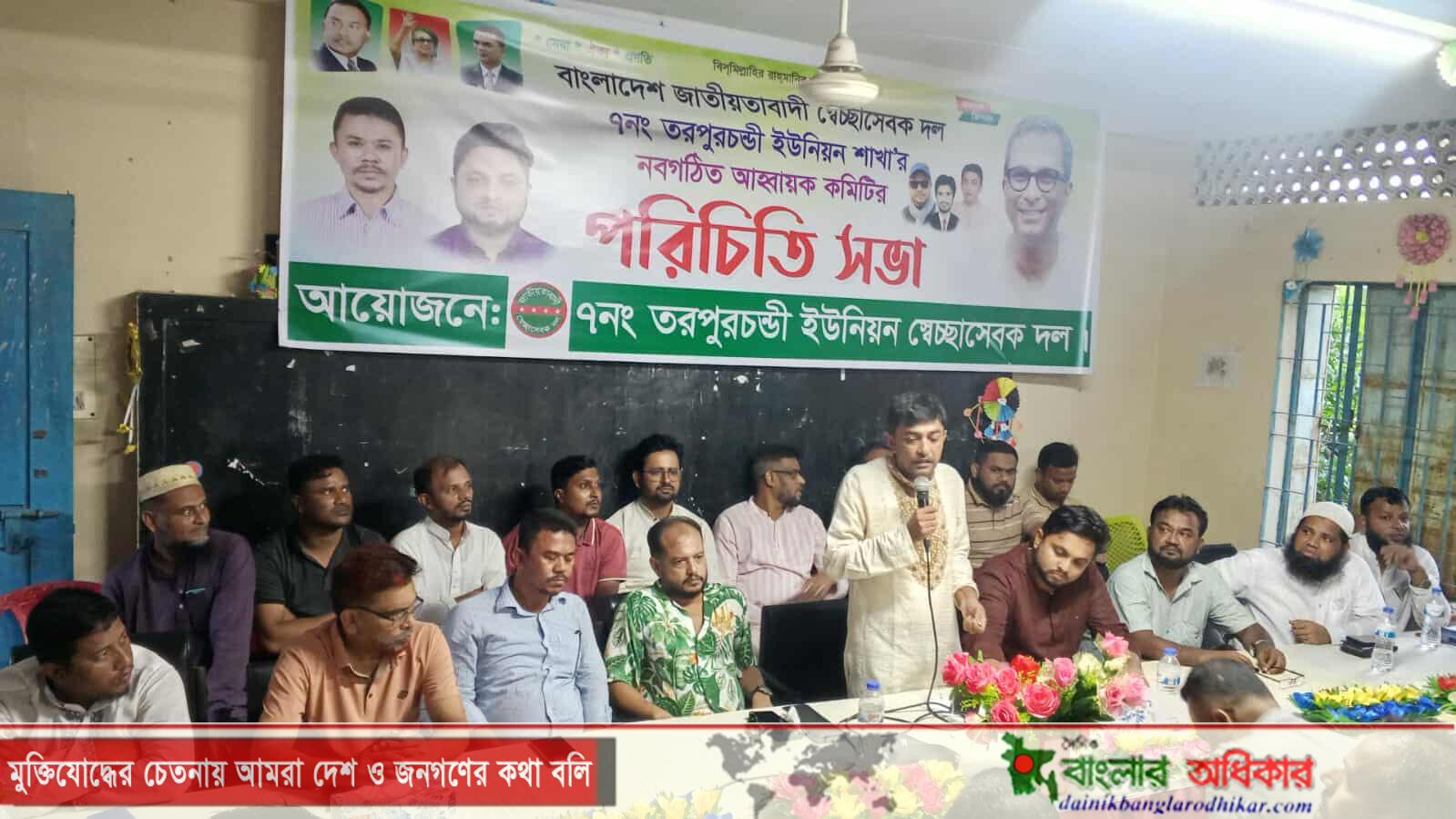ইউনিয়ন স্বেচ্ছাসেবক দলের আহ্বায়ক মোঃ ছিদ্দিক খন্দকারের সভাপতিত্বে এবং সদস্য সচিব এমরান গাজীর সঞ্চলনায়, বিশেষ অতিথি’র বক্তব্য রাখেন সদর থানা স্বেচ্ছাসেবক দলের আহ্বায়ক মোঃ আবু হানিফ কাকন,সদস্য সচিব পীরজাদা জুনায়েদ উল্লাহ খান, ইউনিয়ন বিএনপির সভাপতি শেখ মুহা.নাজমুল হাসান, সাধারন সম্পাদক শাহাদাৎ হোসেন গাজী,এছাড়া আরো উপস্থিত ছিলেন সদর থানা স্বেচ্ছাসেবক দলের সিনিয়র যুগ্ন আহ্বায়ক আঃ হান্নান মিজি,মোঃ আবুল হাসেম গাজী, মোঃ সোহেল হোসেন মৃধা,আঃ আউয়াল, মোহাম্মদ হোসেন নয়ন,আবু সুফিয়ান,জাহিদুল ইসলাম নোমান,তরপুরচন্ডী ইউনিয়ন স্বেচ্ছাসেবক দলের সিনিয়র যুগ্ন আহ্বায়ক সোহেল গাজী, স্বেচ্ছাসেবক নেতা শাহ আলম হাওলাদার সহ ইউনিয়ন বিএনপি ও স্বেচ্ছাসেবক দলের নবাগত আহ্বায়ক কমিটির সকল নেতৃবৃন্দেরা। এসময় বক্তারা বলেন- জাতীয় সংসদ নির্বাচন একেবারেই সন্নিকটে ‘ তাই আগামী নির্বাচনে বাংলাদেশ জাতীয়তা বাদী দল বিএনপির ভারপ্রাপ্ত চেয়ারম্যান দেশ নায়ক তারেক রহমানকে আমরা আগামী রাষ্ট্র নায়ক বসাতে আমরা আমাদের এই নির্বাচনে চাঁদপুর সদর হাইমচর ৩ আসনের সংসদ সদস্য প্রার্থী শেখ ফরিদ আহমেদ মানিক সাহেবের হাত কে শক্তিশালী করতে স্বেচ্ছাসেবক দল এক ও ঐক্যবদ্ধ হয়ে ধানের শীষ মার্কায় ভোট জয়যুক্ত করবো।