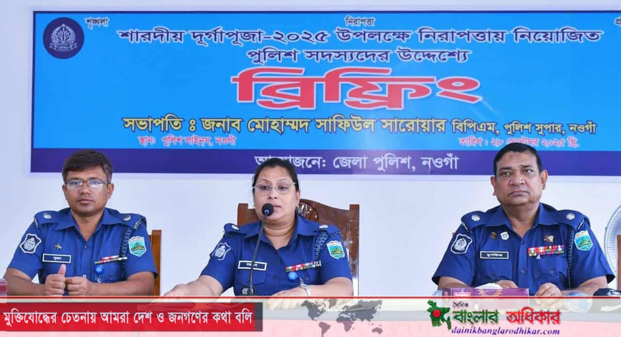 আজ ২৮ সেপ্টেম্বর ২০২৫ রবিবার নওগাঁ জেলার অতিরিক্ত পুলিশ সুপার (প্রশাসন ও অর্থ) জনাব ফারজানা হোসেন পুলিশ লাইন্স ড্রিলশেডে শারদীয় দূর্গাপূজা ২০২৫ উপলক্ষে নিরাপত্তার দায়িত্বে নিয়োজিত পুলিশ সদস্যদের উদ্দেশ্যে ব্রিফিং প্রদান প্রদান করেন।