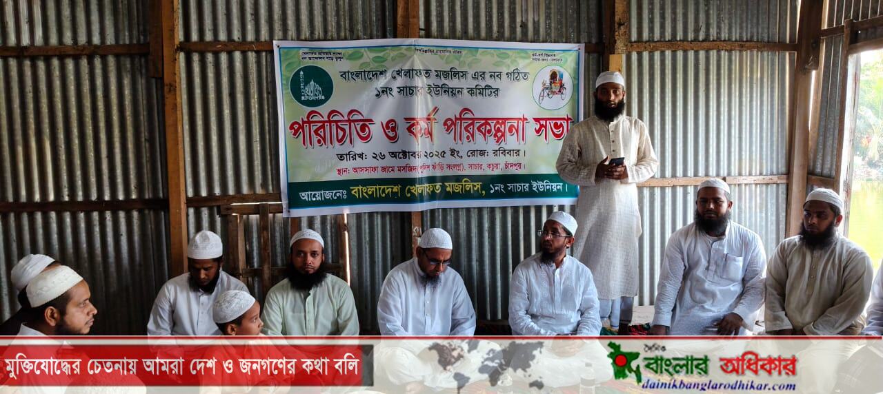 বাংলাদেশ খেলাফত মজলিসের নবগঠিত ১নং সাচার ইউনিয়ন কমিটির উদ্যোগে পরিচিতি ও কর্মপরিকল্পনা সভা অনুষ্ঠিত হয়েছে। রবিবার (২৬ অক্টোবর ২০২৫ ইং) বিকেলে সাচার পুলিশ ফাঁড়ি সংলগ্ন আসসাফা জামে মসজিদে এ অনুষ্ঠান অনুষ্ঠিত হয়। এ অনুষ্ঠানে প্রধান অতিথি হিসেবে উপস্থিত ছিলেন বাংলাদেশ খেলাফত মজলিসের কেন্দ্রীয় নেতা ও চাঁদপুর-১ (কচুয়া) আসনের সংসদ সদস্য পদপ্রার্থী মুফতি আনিসুর রহমান কাসেমী।