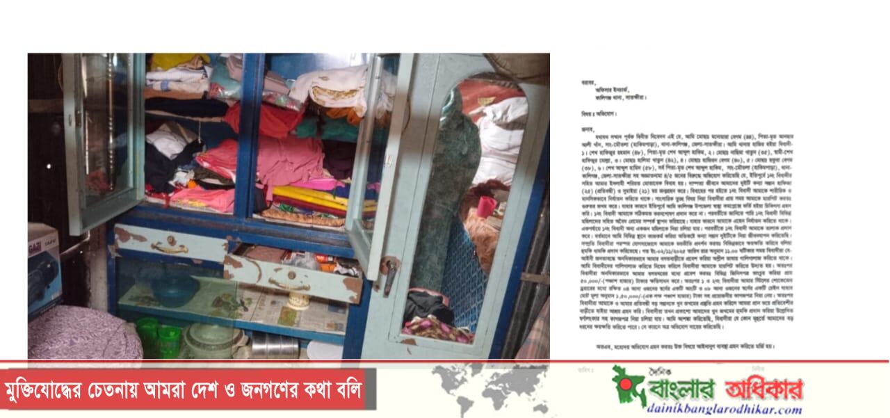 সম্প্রতি, গত রবিবার(২ নভেম্বর) গভীর রাতে অভিযুক্তরা বেআইনি জনতাবদ্ধে তার বসতবাড়িতে প্রবেশ করে অশালীন ভাষায় গালাগাল করে এবং বাধা দিতে গেলে ঘরে ভাঙচুর চালিয়ে প্রায় ৫০ হাজার টাকার ক্ষতি সাধন করে। এ সময় তারা স্টিলের শোকেজ ভেঙে ৪ আনা ওজনের একটি স্বর্ণের আংটি ও ৮ আনা ওজনের একটি চেইনসহ মোট ১ লাখ ৫০ হাজার টাকার স্বর্ণালংকার ও গুরুত্বপূর্ণ কাগজপত্র নিয়ে যায়।