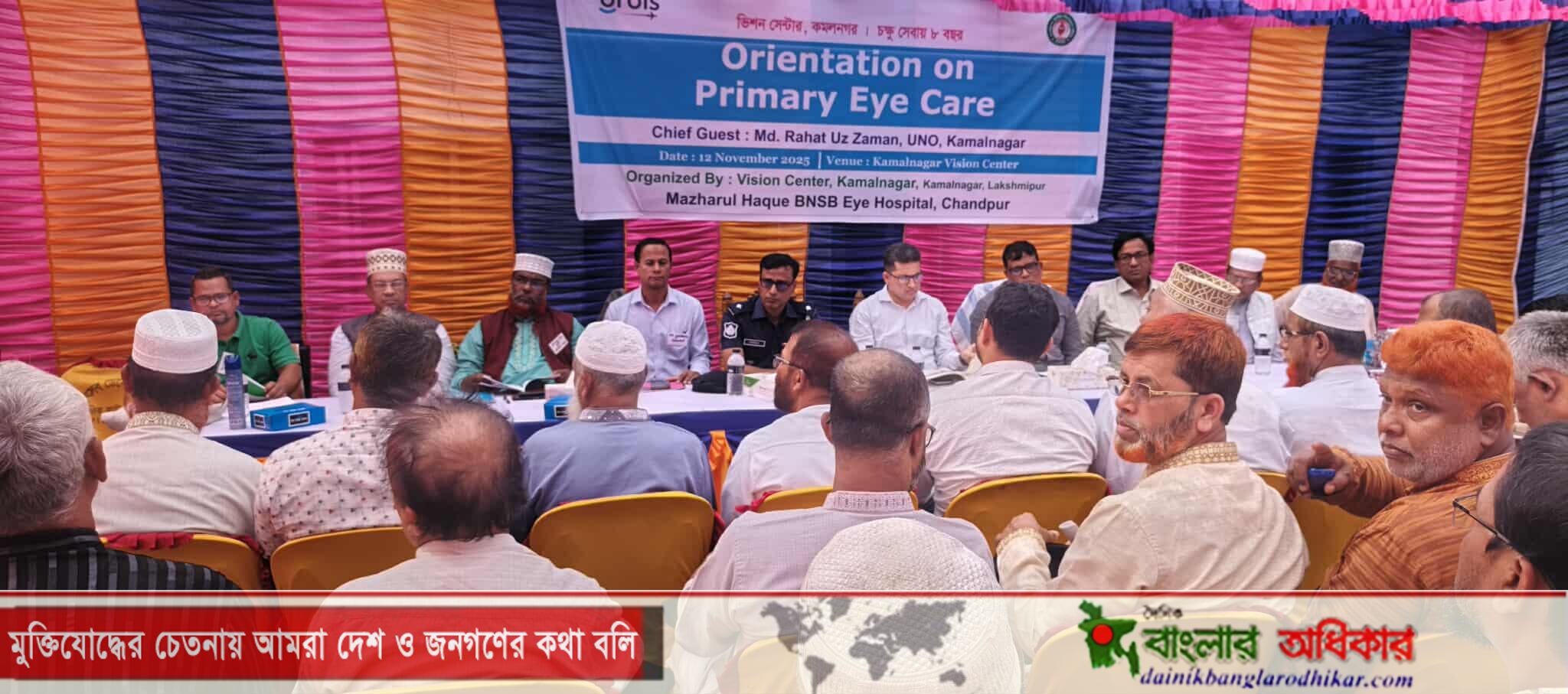 এ উপলক্ষে বুধবার দুপুরে ‘ভিশন সেন্টার’ তাদের কার্যালয়ে উপজেলার সকল শিক্ষা প্রতিষ্ঠানের প্রধান এবং স্থানীয় গণ্যমান্যদের নিয়ে অরিয়েন্টেশনের আয়োজন করেন। এতে প্রধান অতিথি ছিলেন, উপজেলা নির্বাহী কর্মকর্তা মোহাম্মদ রাহাত উজ জামান। বিশেষ অতিথি ছিলেন, কমলনগর থানার ভারপ্রাপ্ত কর্মকর্তা (ওসি) মোহাম্মদ তৌহিদুল ইসলাম, মাধ্যমিক শিক্ষা কর্মকর্তা মোহাম্মদ তৌহিদুল ইসলাম, প্রাথমিক শিক্ষা কর্মকর্তা প্রান্তিক সাহা, হাজিরহাট হামেদিয়া কামিল মাদ্রাসার অধ্যক্ষ মাওলানা দেলোয়ার হোসেন, উপজেলা জামায়াতের আমীর মাওলানা আবুল খায়ের ও প্রেসক্লাবের সভাপতি ইউছুফ আলী মিঠু। অনুষ্ঠানে স্বাগত বক্তব্য রাখেন চাঁদপুর মাজহারুল হক চক্ষ হাসপাতের প্রোগ্রাম অফিসার মো. আল আমিন।