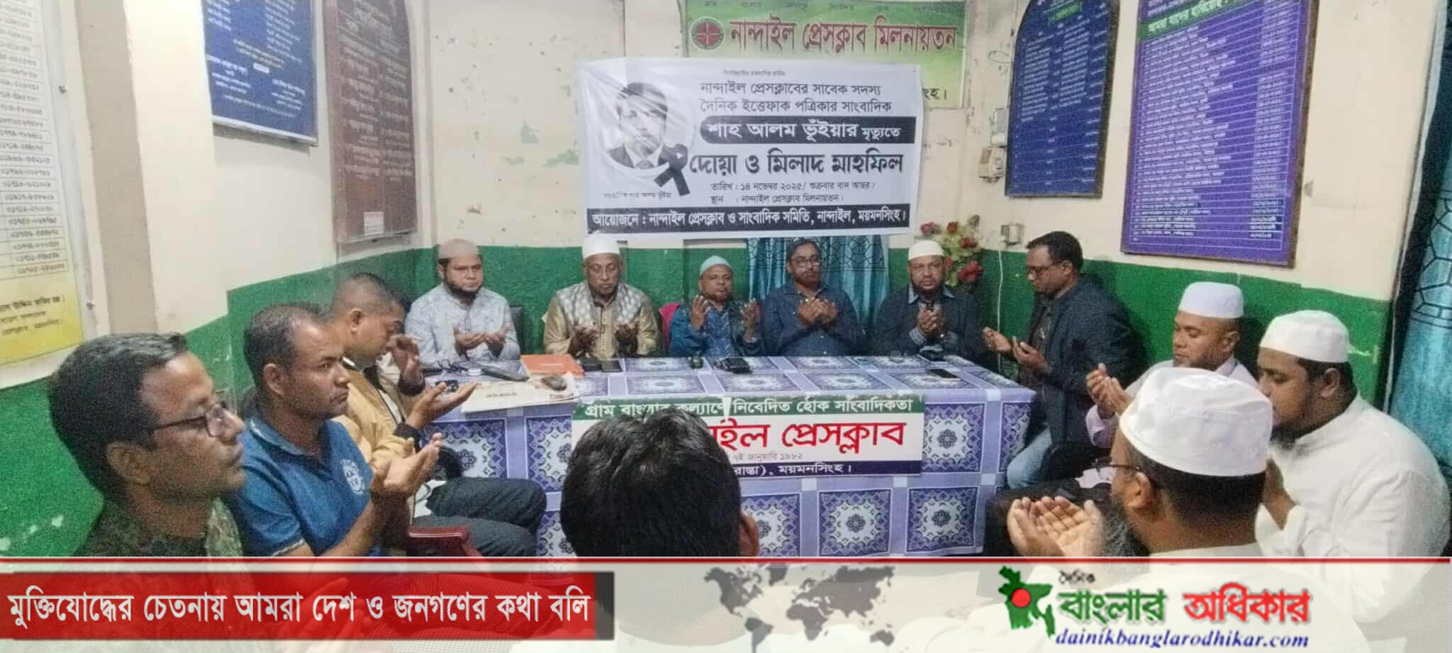 ময়মনসিংহের নান্দাইল উপজেলায় দৈনিক ইত্তেফাক প্রতিনিধি মরহুম শাহ আলম ভূইঁয়ার আত্মার মাগফেরাত কামনায় দোয়া ও মিলাদ মাহফিল শুক্রবার (১৪ নভেম্বর) সন্ধ্যায় নান্দাইল প্রেসক্লাব কার্যালয়ে অনুষ্ঠিত হয়েছে।