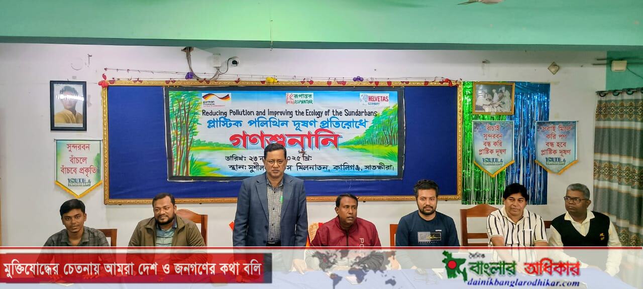সাতক্ষীরার কালিগঞ্জে পলিথিন ও প্লাস্টিক দূষণ প্রতিরোধে গণশুনানি অনুষ্ঠিত হয়েছে। রবিবার (২৩ নভেম্বর) সকালে উপজেলার সুশীলন অফিসের মিলনায়তনে গণশুনানির আয়োজন করে বেসরকারি উন্নয়ন সংস্থা রূপান্তর। রূপান্তরের বাস্তবায়নে এবং সুইজারল্যান্ড সরকারের সহায়তায় পরিচালিত সুন্দরবন ম্যানগ্রোভ বন ও সংলগ্ন অঞ্চলে পলিথিন ও প্লাস্টিক দূষণ কমানো এবং বাস্তুসংস্থান উন্নয়ন” প্রকল্পের আওতায় এ কার্যক্রম পরিচালিত হচ্ছে।রূপান্তরের জেলা সমন্বয়কারী গোলাম কিবরিয়া’র সভাপতিত্বে