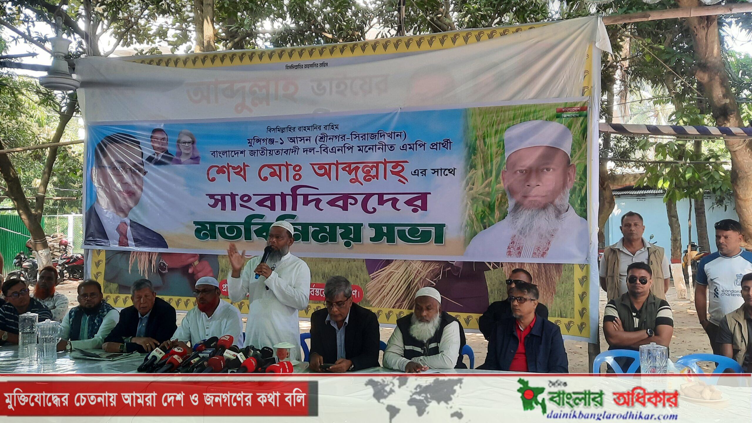 মুন্সীগঞ্জের সিরাজদিখানে বাংলাদেশ জাতীয়তাবাদী দল (বি এন পি) মনোনীত প্রার্থী শেখ মোঃ আব্দুল্লাহ জেলার প্রিন্ট ও ইলেকট্রনিক সাংবাদিক দের সাথে মতবিনিময় সভা করেছেন।২৪নভেম্বর সোমবার বেলা ১১টায় উপজেলার শেখর নগর ইউনিয়ন এর গোপালপুর গ্রামে প্রথমে পবিত্র কুরআন তিলাওয়াত ও,গিতা পাঠের মধ্য দিয়ে শেখ মো: আব্দুল্লাহ্’র সভাপতিত্বে এ মতবিনিময় সভা অনুষ্ঠিত হয়।