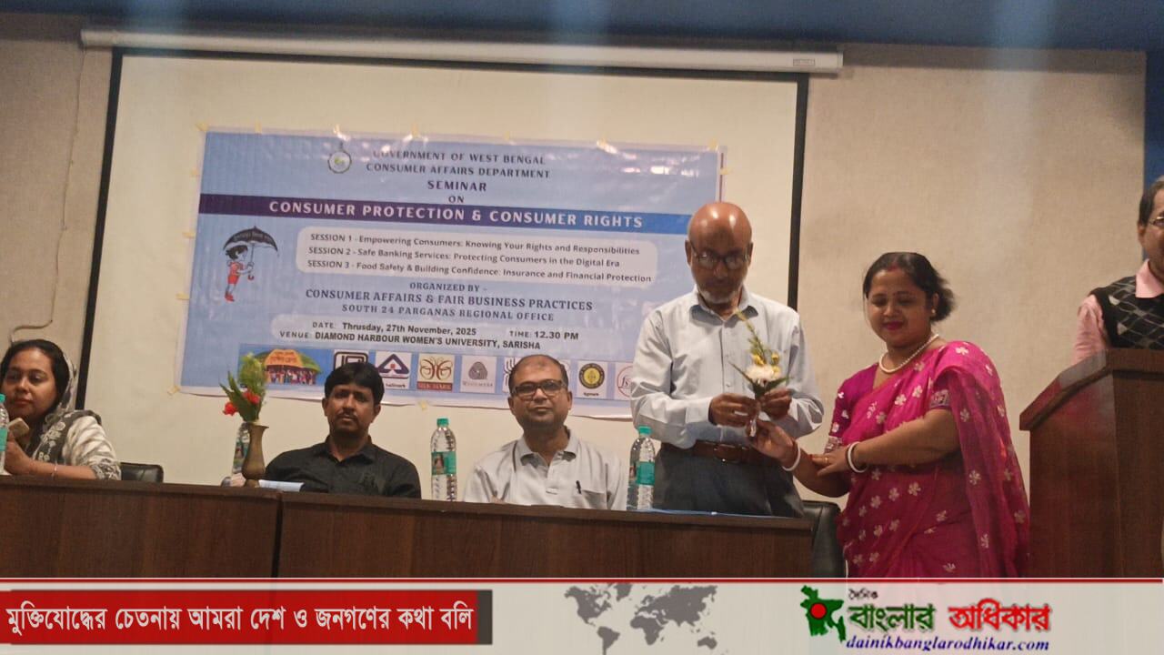 পশ্চিমবঙ্গ সরকারের উপভোক্তা বিষয়ক ও ন্যায্য বানিজ্য অনুশীলন অধিকার বিভাগের পরিচালনায় ২৭শে নভেম্বর ২০২৫ দক্ষিন ২৪ পরগণার ডায়মন্ড হারবার সরিষা ওমেনস ইউনিভার্সিটির কোমিওনিটি হলে একটি সচেতনতা শিবির অনুষ্ঠিত হয়। এখানে বহু বিশিষ্ট ব্যক্তিবর্গ ও প্রায় ৫০ জন ছাত্রী এই সভায় উপস্থিত ছিলেন। উক্তসভা উদ্বোধনী বক্তৃতাদেন ডাঃ সাঈদুর রহমান রেজিস্ট্রার ডায়মন্ড হারবার ওমেনস ইউনিভার্সিটি সরিষা। এর পর ক্রেতাসুরক্ষা দপ্তর থেকে মূল্যবান বক্তব্য রাখেন দপ্তরেরই আধিকারিক নবদিত আদিত্য, ড্যাড কনজিউমার অ্যাফেয়ার্স এবং এফবিপি,ডি এইচ আঞ্চলিক অফিস পশ্চিম বঙ্গ সরকার। ভারতীয় জীবন বিমা নিগমের ডেভলপমেন্ট অফিসার গোরাচাঁদ সরকার এল আই সি আই ডায়মন্ড হারবার তিনিও জীবন বীমা সম্পর্কে ছাত্র ছাত্রীদের বোঝালেন। খাদ্য নিরাপত্তা এবং ভোক্তা সুরক্ষা নিয়ে বিস্তারিত আলোচনা করেন ফাহমিদা হোসেন,ফুড সেফটি অফিসার ফলতা, মগরাহাট-১ ও ২ পশ্চিম বঙ্গ সরকার। এছাড়া নিরাপদ ব্যাঙ্কিং পরিষেবা,ডিজিটাল যুগে গ্রাহকদের সুরক্ষা নিয়ে বক্তব্য রাখেন ডায়মন্ড হারবার স্টেট ব্যাংক অফ ইন্ডিয়ার চিপ ম্যানেজার সায়ন শীল। সমগ্র অনুষ্ঠানটি পরিচালনা করেন ডিস্ট্রিক্ট কনজিউমার প্রটেকশন কাউন্সিল মেম্বার গোপাল চন্দ্র মন্ডল। এছাড়াও উপস্থিত ছিলেন ড. জয়ন্ত মন্ডল সহযোগী অধ্যাপক ডায়মন্ড হারবার সরিষা ওমেনস ইউনিভার্সিটি,দেবনাথ গায়েন ফাইনান্স অফিসার ডায়মন্ড হারবার ওমেনস ইউনিভার্সিটি সরিষা সহ সরিষা ওমেনস্ ইউনিভারসিটির বহু ছাত্রী ও অন্যান্য বিশিষ্ট ব্যক্তিবর্গ প্রমুখ।