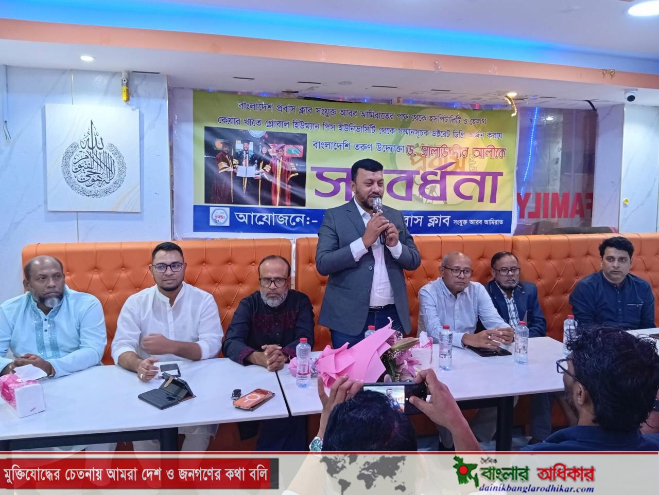 হসপিটালিটি ও হেলথ কেয়ার খাতে গ্লোবাল হিউম্যান পিস ইউনিভার্সিটি থেকে সম্মানসূচক ডক্টরেট ডিগ্রির কৃতিত্ব অর্জন করায় হাটহাজারীর কৃতি সন্তান, তরুণ উদ্যোক্তা, এশিয়ান হেলথ কেয়ার গ্রুপের চেয়ারম্যান এবং এশিয়ান স্পেশালাইজড হসপিটালের ম্যানেজিং ডিরেক্টর ড. সালাহউদ্দিন আলীকে ফুলেল শুভেচ্ছা ও সংবর্ধনা প্রদান করেছে বাংলাদেশ প্রবাস ক্লাব সংযুক্ত আরব আমিরাত।