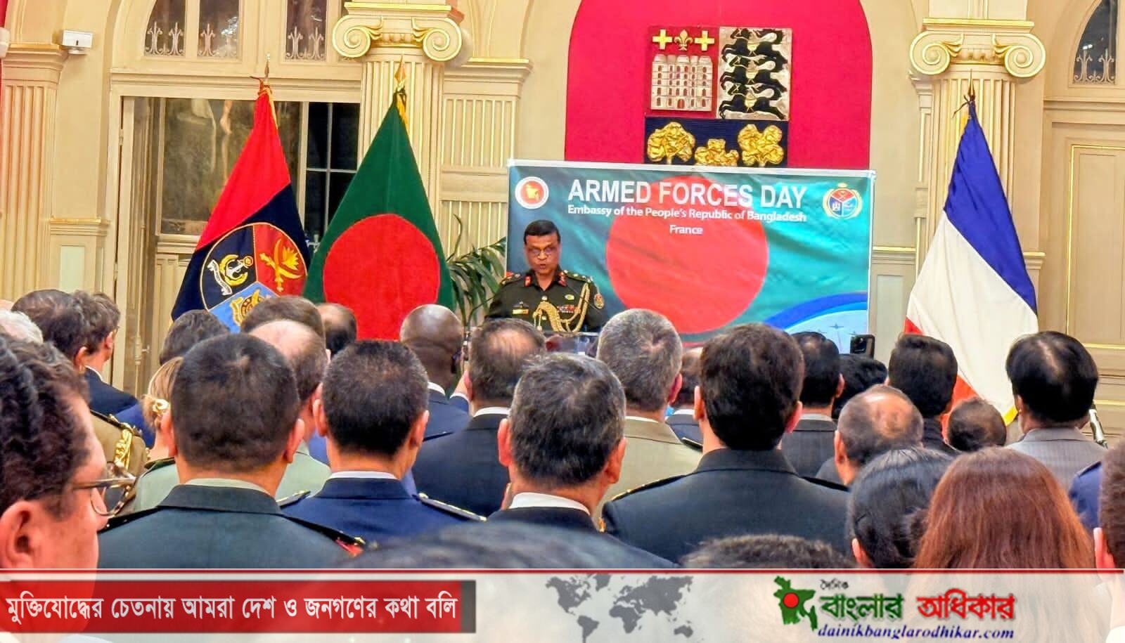 ফ্রান্সের রাজধানী প্যারিসে বর্ণাঢ্য আয়োজনের মধ্য দিয়ে বাংলাদেশের সশস্ত্র বাহিনী দিবস পালিত হয়েছে। বিভিন্ন দেশের কূটনৈতিক ও সশস্ত্র বাহিনীর উচ্চপদস্থ কর্মকর্তাদের অংশগ্রহণে আয়োজিত অনুষ্ঠানে বাংলাদেশ সশস্ত্র বাহিনীর ওপর নির্মিত বিশেষ প্রামাণ্যচিত্র প্রদর্শন করা হয়।