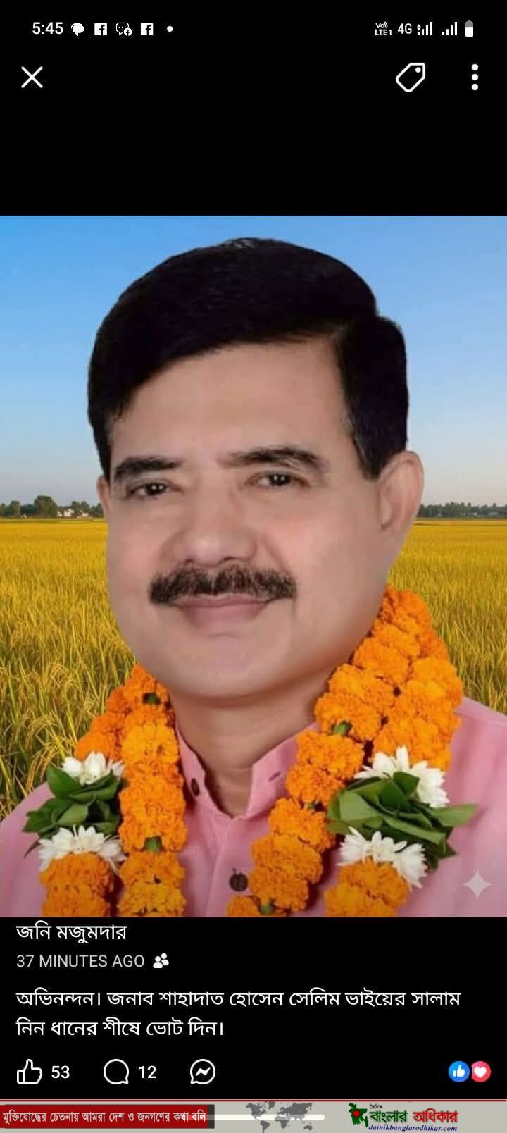 অন্যদিকে ঢাকা দক্ষিণ বিএনপি’র সিনিয়র যুগ্ন আহবায়ক ও সাবেক কমিশনার এবং লক্ষ্মীপুর -১ রামগঞ্জ আসনের ধানের শীষের মনোনয়ন প্রত্যাশী মোঃ হারুনুর রশিদ বলেন শাহাদাত হোসেন সেলিম আজকে মাত্র দলে যোগ দিয়েছেন আর আমি দীর্ঘ দিন থেকেই দলের সাথে জড়িত আমি হামলা মামলা এবং জেল খেটেছি। আমিই এই আসনে ধানের শীষের মনোনয়ন প্রত্যাশা করছি। আমি সাধারণত জানি,দলের মহাসচিব বা ভারপ্রাপ্ত চেয়ারম্যান মনোনয়ন ঘোষণা করেন। কিন্তু তাকে তো মহাসচিব বা দলের ভারপ্রাপ্ত চেয়ারম্যান ঘোষণা দেননি। আমি দলের ভারপ্রাপ্ত চেয়ারম্যান ও মহাসচিবের ঘোষণার অপেক্ষায় আছি।