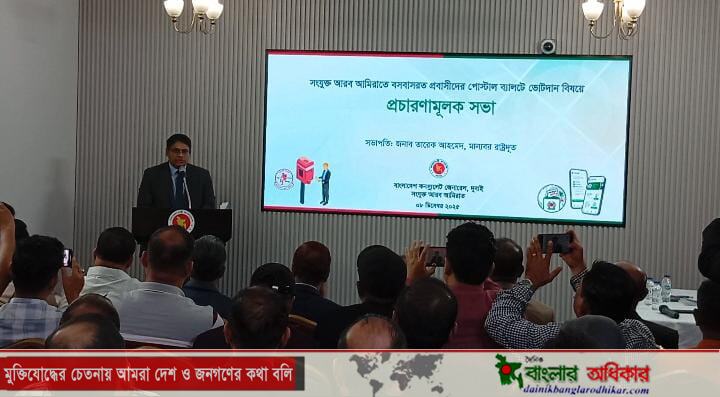 সংযুক্ত আরব আমিরাতে বসবাসরত প্রবাসী বাংলাদেশিদের পোস্টাল ব্যালট প্রক্রিয়া সম্পর্কে অবহিত ও উৎসাহিত করতে দুবাইস্থিত বাংলাদেশ কনস্যুলেট জেনারেলের উদ্যোগে এক প্রচারণা সভা অনুষ্ঠিত হয়েছে। সোমবার সন্ধ্যায় কনস্যুলেট প্রাঙ্গণে আয়োজিত এই সভায় সভাপতিত্ব করেন আমিরাতে নিযুক্ত বাংলাদেশের রাষ্ট্রদূত তারেক আহমেদ। অনুষ্ঠানে বিশেষ অতিথি হিসেবে উপস্থিত ছিলেন দুবাইয়ের কনসাল জেনারেল মোহাম্মদ রাশেদুজ্জামান।