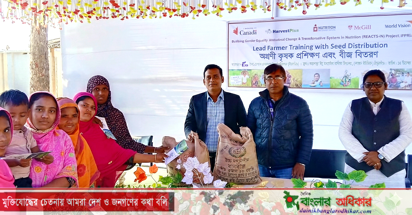 রবিবার (১৪ ডিসেম্বর) দুপুরে আন্তর্জাতিক খাদ্যনীতি গবেষণা ইনস্টিটিউট (IFPRI) হারভেস্ট প্লাস প্রোগ্রামের রিঅ্যাক্টস- ইন প্রকল্পের বাস্তবায়নে ও ইএসডিও’র আয়োজনে ঠাকুরগাঁও সদর উপজেলার নারগুন ইউনিয়নের কোহরপাড়া নিম্ন মাধ্যমিক বালিকা বিদ্যালয় মাঠে অগ্রণী কৃষক প্রশিক্ষণ ও বীজ বিতরণ প্রোগ্রামটি অনুষ্ঠিত হয়।
