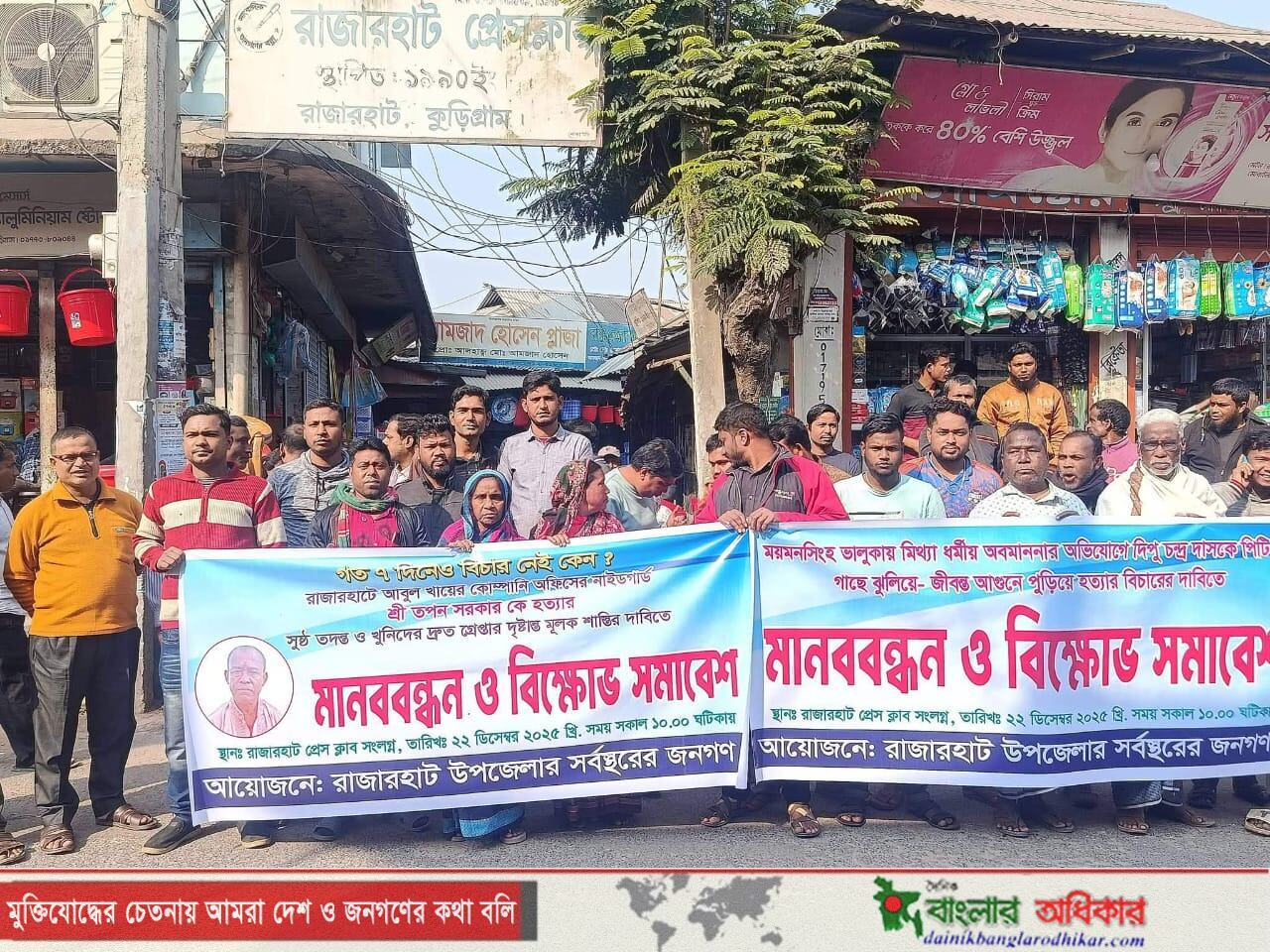 কুড়িগ্রামের রাজারহাটে আবুল খায়ের কোম্পানির রাজারহাট অফিসের নৈশপ্রহরী তপন সরকার হত্যার ঘটনায় জড়িতদের দ্রুত গ্রেপ্তার ও সুষ্ঠু তদন্তের দাবিতে মানববন্ধন ও বিক্ষোভ কর্মসূচি পালন করেছে এলাকাবাসী।