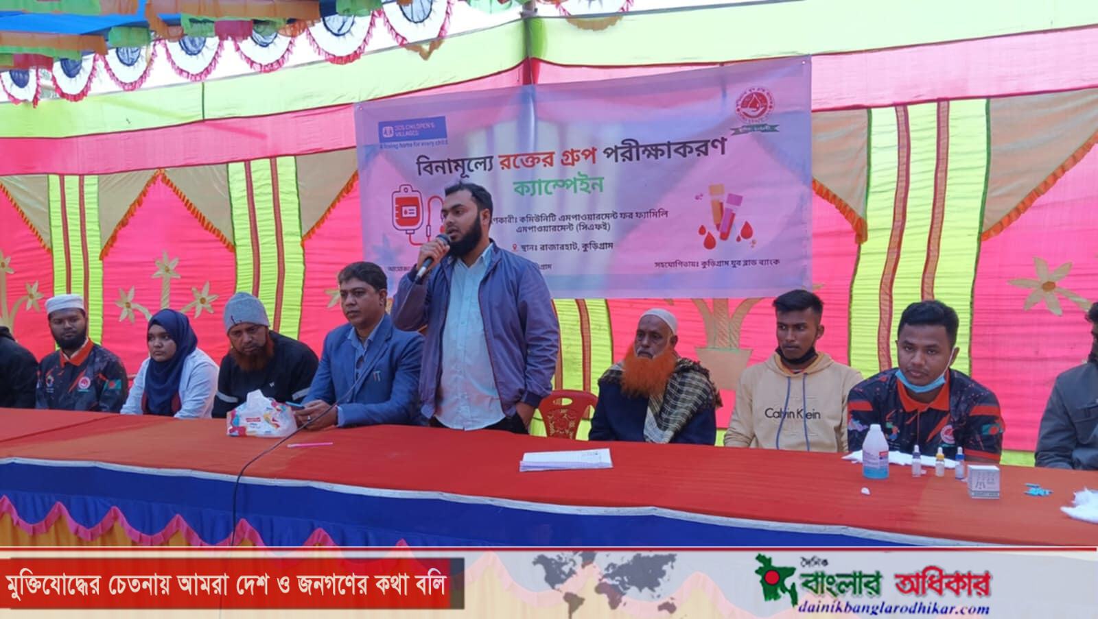 মানুষকে রক্তের গ্রুপ সম্পর্কে সচেতন করা এবং জরুরি সময়ে স্বেচ্ছায় রক্তদানে উদ্বুদ্ধ করার লক্ষ্যে কুড়িগ্রামের রাজারহাট উপজেলায় এক বিনামূল্যে রক্তের গ্রুপ পরীক্ষাকরণ ক্যাম্পেইন অনুষ্ঠিত হয়েছে।