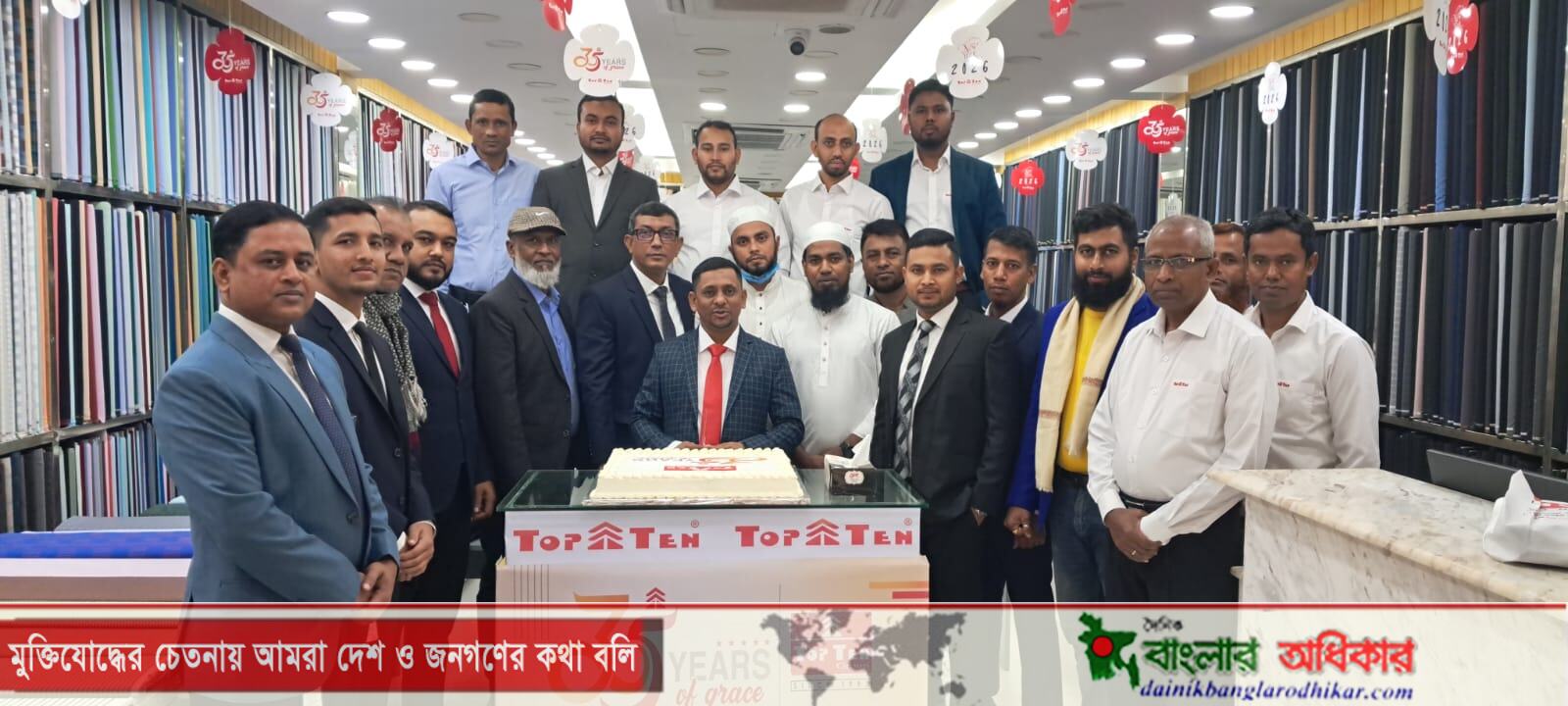 ৩৫ বছর পূর্তি উপলক্ষ্যে টপ টেন গ্রুপের অঙ্গপ্রতিষ্ঠান Top Ten Mart Ltd. Top Ten Fabrics & Tailors Ltd. Top Ten Fashion Ltd. Top Ten Tiles & Sanitary Ltd. এর কিশোরগঞ্জ শাখায় শনিবার (৩ জানুয়ারি) সকালে কোরআন তেলাওয়াত এবং দোয়ার মাধ্যমে অনুষ্ঠান শুরু হয়। পরে এমপ্লয়িদের নিয়ে কেক কাটার মাধ্যমে অনুষ্ঠান উদযাপন করা হয়।