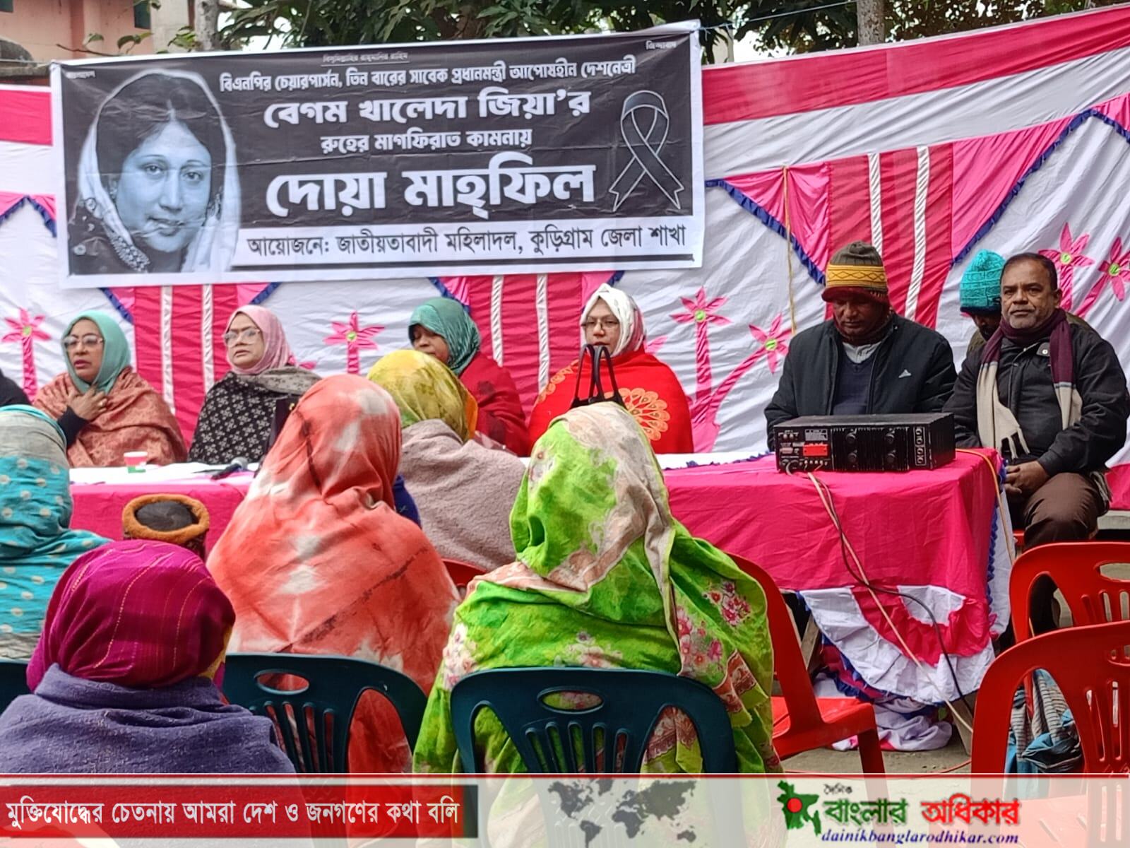 প্রধান অতিথি হিসেবে বক্তব্য রাখেন মোছাঃ মিলি হোসেন কায়কোবাদ,সাধারণ সম্পাদক কুড়িগ্রাম জেলা জাতীয়তাবাদী মহিলা দল।বিশেষ অতিথি হিসেবে বক্তব্য রাখেন রেশমা বেগম সভাপতি জেলা জাতীয়তাবাদী মহিলা দল।আলোচনা সভায় সভায় সভাপতিত্ব করেন মোছাঃ হাওয়া বেগম সভাপতি রাজারহাট উপজেলা জাতীয়তা বাদী মহিলাদল।এসময় দোয়া মাহফিল ও আলোচনা সভায় সার্বিক সহযোগীতা করেন রাজারহাট উপজেলা বিএনপির যুগ্ন আহ্বায়ক মোঃ জাকির হোসেন,