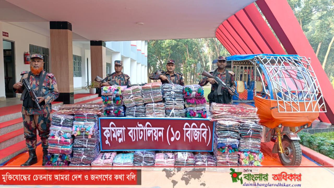 কুমিল্লায় ১০-বিজিবির অভিযানে অর্ধকোটি টাকার অবৈধ ভারতীয় শাড়ি উদ্ধার