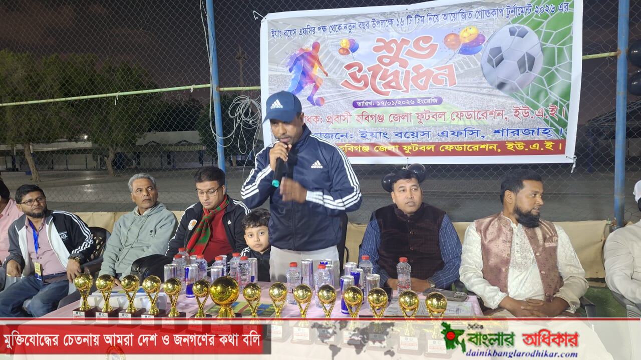 সংযুক্ত আরব আমিরাতে ইয়াং বয়েস এফসির পক্ষ থেকে নতুন বছর উপলক্ষে গোল্ডকাপ ফুটবল টুর্নামেন্ট ২০২৬ উদ্ভোধনকালে বক্তারা এসব কথা বলেন। ১৬ টি টিমের অংশগ্রহণের আয়োজিত টুর্নামেন্টের সার্বিক সহযোগিতায় রয়েছে প্রবাসী হবিগঞ্জ জেলা ফুটবল ফেডারেশন ইউএই।