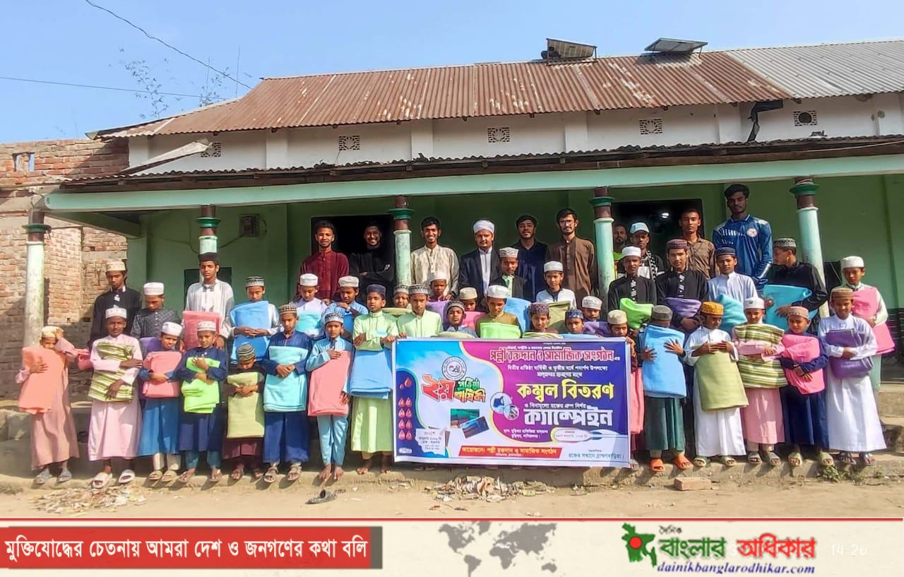 মাদ্রাসার ছাত্রদের মাঝে কম্বল বিতরণ করলো ”পল্লী রক্তদান ও সামাজিক সংগঠন”