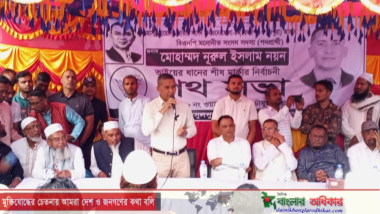 তিনি আরও বলেন,৭১ সালে মা বোনদের ইজ্জত নিয়ে টানাটানি করা একটি দল এখন ধর্মকে পূজি করে বলে যে রোজা আর পূজা নাকি একই বিষয়। তারা এদেশের মানুষের অধিকার নিয়ে লুটতরাজ করেছে। তারা এখনো মানুষের অধিকার নিয়ে দুর্বৃত্তায়ন করছে। আগামী ১২ ফেব্রুয়ারি সকলে ঐক্যবদ্ধ হয়ে ধানের শীষে ভোট দিয়ে এসব জুলুম নির্যাতনকারীদের রুখে দিতে হবে। জেলে মাঝিমাল্লার ভাতা ও কৃষকদের প্রণোদনা সুবিধাসহ হাতিয়ে নেয়া সালিশ বিচারের নামে যারা নিরিহ জনগণকে জিম্মি করে টাকা হাতিয়ে নেয় যারা মাদক কারবারি ও চাঁদাবাজি করে মানুষের জীবন দুর্বিষহ করছে তাদের নামের তালিকা করে দেয়ার অনুরোধ জানান কেন্দ্রীয় এ নেতা।
