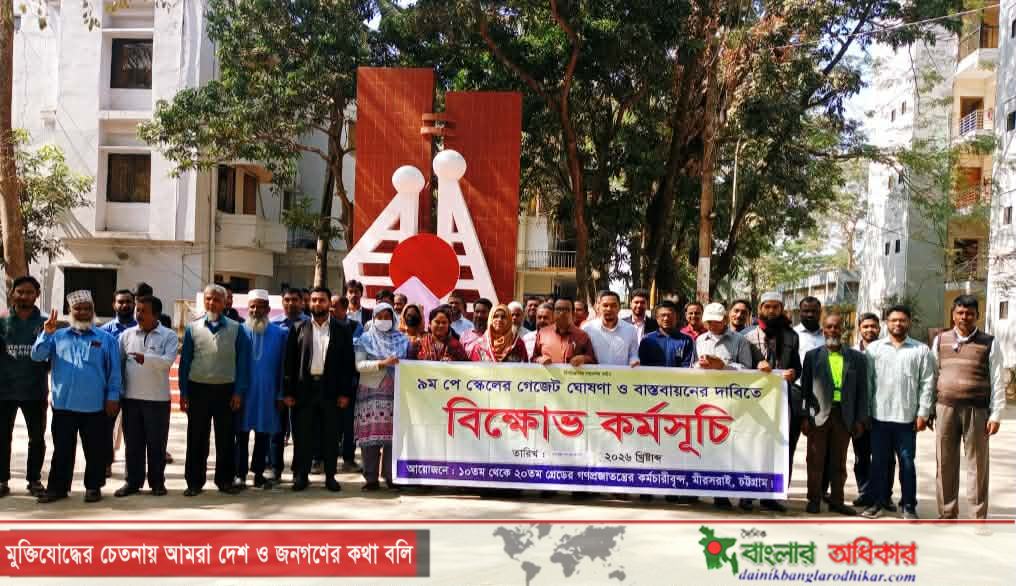 বৈষম্যমুক্ত জাতীয় ৯ম পে-স্কেলের গেজেট দ্রুত বাস্তবায়নের দাবিতে মীরসরাইয়ে বিক্ষোভ মিছিল করেছে বাংলাদেশ নন গেজেটেট সরকারী কর্মচারী কল্যাণ সমিতি ১১-২০ গ্রেডভুক্ত কর্মচারীরা।
