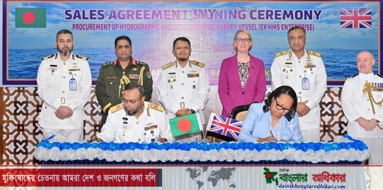 বাংলাদেশ নৌবাহিনী সদর দপ্তরে আজ রবিবার (০৮-০২-২০২৬) বাংলাদেশ এবং যুক্তরাজ্যের মধ্যে Government-to-Government (G2G) এর আওতায় হাইড্রোগ্রাফিক ও ওশানোগ্রাফিক জরিপ জাহাজ ‘HMS ENTERPRISE’ ক্রয় চুক্তি স্বাক্ষরিত হয়েছে। বাংলাদেশের পক্ষে চুক্তটি স্বাক্ষর করেন সহকারী নৌবাহিনী প্রধান রিয়ার এডমিরাল মোঃ শফিকুর রহমান এবং যুক্তরাজ্যর পক্ষে যুক্তরাজ্যের প্রতিরক্ষা মন্ত্রণালয়ের বাণিজ্যিক কর্মকর্তা মিস ন্যানিসে কালোবুলাওয়াসাইকাবারা (Ms Nanise Qalobulawasaikabara)। এ চুক্তি স্বাক্ষর অনুষ্ঠানে উপস্থিত ছিলেন বাংলাদেশ নৌবাহিনী প্রধান এডমিরাল এম নাজমুল হাসান। এছাড়াও, উক্ত অনুষ্ঠানে বাংলাদেশে নিযুক্ত যুক্তরাজ্যের হাই-কমিশনার, যুক্তরাজ্যের সামরিক উপদেষ্টা, সশস্ত্র বাহিনী বিভাগের প্রিন্সিপাল স্টাফ অফিসার, বিভিন্ন মন্ত্রণালয়ের যুগ্মসচিবসহ সশস্ত্র বাহিনী বিভাগ এবং নৌবাহিনীর ঊর্ধ্বতন কর্মকর্তাগণ উপস্থিত ছিলেন।