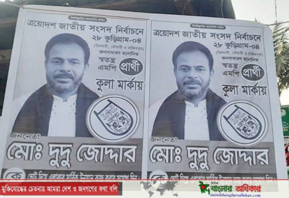 এমন পরিস্থিতিতে হঠাৎ করে ‘দুদু জোদ্দার’ নামের এক ব্যক্তির আবির্ভাব ঘটে। তিনি নিজেকে স্বতন্ত্র সংসদ সদস্য প্রার্থী দাবি করে ‘কুলা’ প্রতীকে ভোট চেয়ে এলাকায় পোস্টারিং ও প্রচারণা শুরু করেন। এতে সাধারণ ভোটারদের মাঝে বিভ্রান্তি সৃষ্টি হয়। পাশাপাশি বিষয়টি নিয়ে প্রশাসনের নীরব ভূমিকা নিয়েও জনমনে প্রশ্ন উঠেছে।