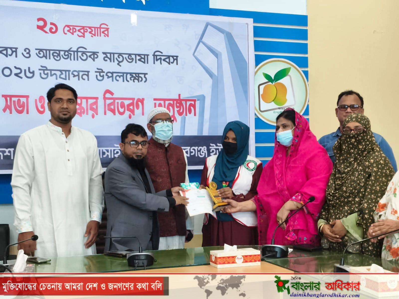 মহান শহীদ দিবস ও আন্তর্জাতিক মাতৃভাষা দিবস ২০২৬ উদযাপন উপলক্ষে আলোচনা সভা ও পুরস্কার বিতরণ অনুষ্ঠান অনুষ্ঠিত হয়েছে। আজ শনিবার (২১ ফেব্রুয়ারি) চাঁপাইনবাবগঞ্জ পৌরসভার কনফারেন্স রুমে এ অনুষ্ঠানের আয়োজন করে বাংলাদেশ রেড ক্রিসেন্ট সোসাইটি, চাঁপাইনবাবগঞ্জ জেলা ইউনিট। অনুষ্ঠানে প্রধান অতিথি হিসেবে উপস্থিত ছিলেন চাঁপাইনবাবগঞ্জ রেড ক্রিসেন্ট সোসাইটির জেলা ইউনিটের চেয়ারম্যান ও জেলা প্রশাসক মোঃ শাহাদাত হোসেন মাসুদ। বিশেষ অতিথি হিসেবে উপস্থিত ছিলেন ভাইস চেয়ারম্যান অ্যাডভোকেট নূরে আলম সিদ্দকী আসাদ এবং সেক্রেটারি মো. খাইরুল ইসলাম। এছাড়াও উপস্থিত ছিলেন নির্বাহী সদস্য অধ্যাপক মোঃ সফিউর রহমান বিপ্লব, মানিক রায়হান, মফিজ উদ্দিন, রোজিয়া সুলতানা ও আইরিন পারভীনসহ অন্যান্য নেতৃবৃন্দ। আলোচনা সভায় বক্তারা ভাষা শহীদদের আত্মত্যাগ গভীর শ্রদ্ধার সঙ্গে স্মরণ করেন এবং নতুন প্রজন্মের মধ্যে মাতৃভাষার প্রতি ভালোবাসা ও সচেতনতা বৃদ্ধির ওপর গুরুত্বারোপ করেন। বক্তারা বলেন, ১৯৫২ সালের ভাষা আন্দোলন বাঙালির আত্মপরিচয় ও অধিকার আদায়ের এক গৌরবোজ্জ্বল অধ্যায়। অনুষ্ঠান শেষে রচনা প্রতিযোগিতায় বিজয়ীদের মাঝে পুরস্কার বিতরণ করেন চাঁপাইনবাবগঞ্জ রেড ক্রিসেন্ট ইউনিটের চেয়ারম্যান ও জেলা প্রশাসক মোঃ শাহাদাত হোসেন মাসুদ। বিজয়ী শিক্ষার্থীদের হাতে সনদ ও উপহার তুলে দেওয়া হয়।