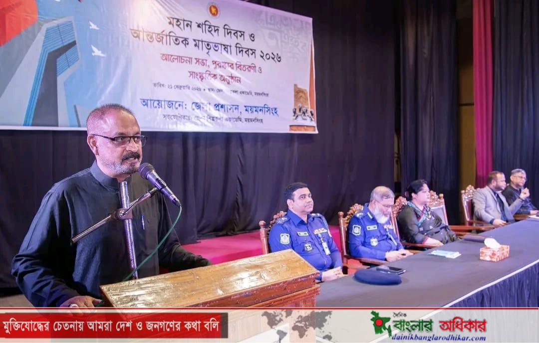 অনুষ্ঠানে ময়মনসিংহ বিভাগীয় কমিশনার ফারাহ শাম্মী এনডিসি বলেন, “রাষ্ট্রভাষা বাংলা চাই” ছিল শুধু ভাষার দাবি নয়, এটি ছিল অধিকার প্রতিষ্ঠার প্রথম ধাপ এবং মাতৃভাষায় কথা বলার মৌলিক অধিকার রক্ষার সংগ্রাম। ১৯৫২ সালের ২১ ফেব্রুয়ারি কোনো সাধারণ তারিখ নয়, এটি বাঙালি জাতির চেতনার উৎস। এই আন্দোলন আমাদের অন্যায়ের বিরুদ্ধে প্রতিবাদ করতে এবং অধিকার আদায়ে দৃঢ় হতে শিখিয়েছে, যার ধারাবাহিকতায় আমরা অর্জন করেছি মহান স্বাধীনতা। তিনি আরও বলেন, শুধু বাংলাদেশ বা পশ্চিমবঙ্গেই নয়, ইউনেসকোর স্বীকৃতি’র মাধ্যমে দিনটি আজ বিশ্বব্যাপী আন্তর্জাতিক মাতৃভাষা দিবস হিসেবে পালিত হচ্ছে।