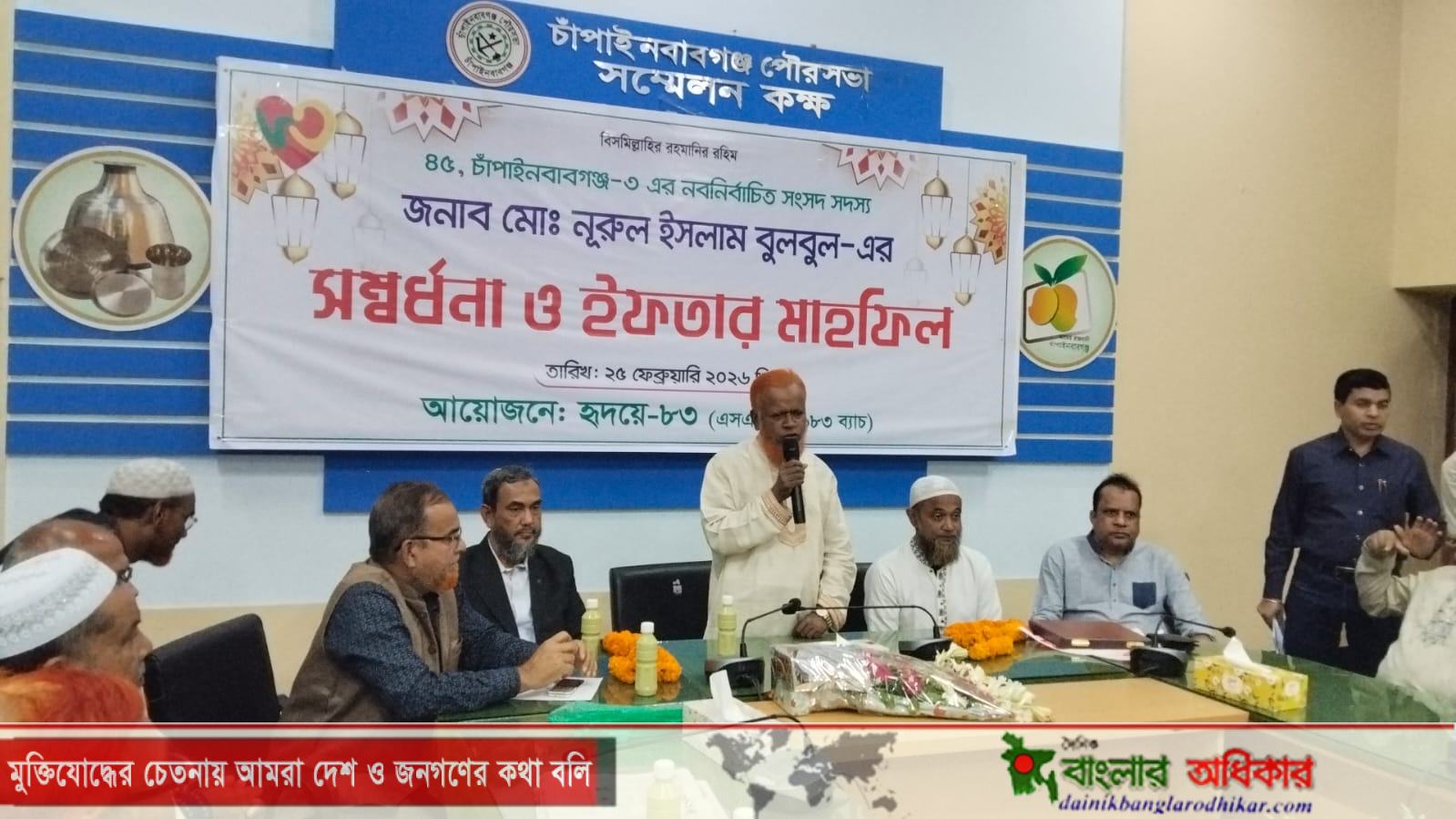 চাঁপাইনবাবগঞ্জ-৩ আসনে সংসদ সদস্য নবনির্বাচিত এমপি মোঃ নূরুল ইসলাম বুলবুল-কে সংবর্ধনা ও ইফতার মাহফিলের আয়োজন করেছে হৃদয়ে-৮৩ (এস.এস.সি-১৯৮৩ ব্যাচ)। ২৫ ফেব্রুয়ারি বুধবার ব্যাচের উদ্যোগে পৌরসভার হল রুমে এ সংবর্ধনা ও ইফতার মাহফিল অনুষ্ঠিত হয়। অনুষ্ঠানে প্রধান অতিথি হিসেবে উপস্থিত ছিলেন চাঁপাইনবাবগঞ্জ-৩ আসনের নবনির্বাচিত সংসদ সদস্য মোঃ নূরুল ইসলাম বুলবুল। এ সময় তিনি হৃদয়ে-৮৩ ব্যাচের উদ্যোগের প্রশংসা করেন এবং সকলের প্রতি কৃতজ্ঞতা প্রকাশ করেন। তিনি এলাকার উন্নয়ন, শিক্ষা ও সামাজিক কর্মকাণ্ডে সবার সহযোগিতা কামনা করেন।অনুষ্ঠানে সভাপতিত্ব করেন হৃদয়ে-৮৩ ব্যাচের সভাপতি মানিক রাইহান। এছাড়াও উপস্থিত ছিলেন ব্যাচের সদস্য হাসিব উদ্দিন, আজিজুর আলম সিদ্দিকী টুটুল, সেরাজুল ইসলাম, তৌহিদুর রহমানসহ অন্যান্য সদস্যবৃন্দ। ইফতার পূর্বে দোয়া ও মোনাজাত পরিচালনা করা হয়। পরে সবাই একসাথে ইফতারে অংশগ্রহণ করেন। আয়োজনটি উৎসবমুখর ও আন্তরিক পরিবেশে সম্পন্ন করে। হৃদয়ে -৮৩ এসএসসি ব্যাচ পক্ষ হতে নবনির্বাচিত এমপি নূরুল ইসলাম বুলবুলের হাতে ক্রেস্ট তুলে দেন। সবশেষে দোয়া পরিচালনা করেন আজকের অনুষ্ঠানে সভাপতি মোঃ মানিক রাইহান।