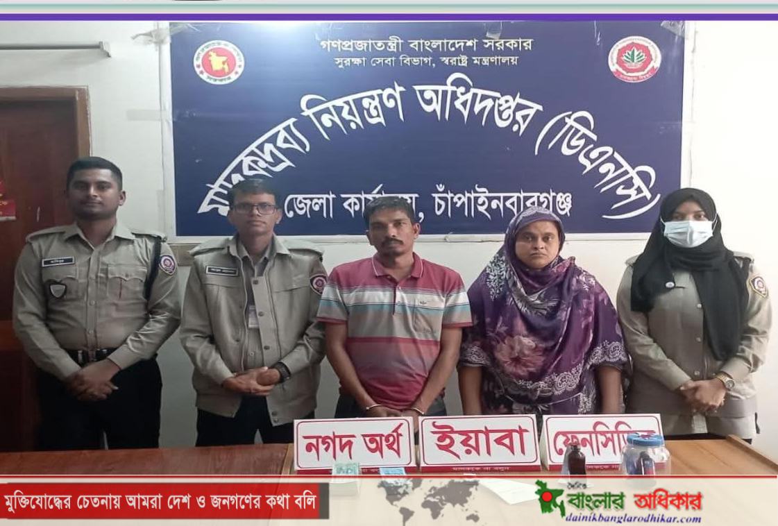 চাঁপাইনবাবগঞ্জে মাদকদ্রব্য নিয়ন্ত্রণ অধিদপ্তরের বিশেষ টাস্কফোর্সের অভিযানে যাবজ্জীবন সাজাপ্রাপ্ত এক পলাতক আসামিসহ দুইজন মাদক কারবারিকে গ্রেফতার করা হয়েছে। বৃহস্পতিবার (৫ মার্চ) সকাল ৭টা ৩০ মিনিট থেকে ৮টা ১০ মিনিট পর্যন্ত চাঁপাইনবাবগঞ্জ সদর মডেল থানাধীন কৃষ্ণগোবিন্দপুর পাঠানপাড়া গ্রামে এ অভিযান পরিচালনা করা হয়। গ্রেফতারকৃতরা হলেন সদর থানার রানীহাটি ইউনিয়নের কৃষ্ণগোবিন্দপুর পাঠানপাড়া গ্রামের মৃত সোলেমান মন্ডল ওরফে কালুর ছেলে মোঃ আরিফ আলী ওরফে আরিফ পাঠান বা বাবা আরিফ (৪৫) এবং তার স্ত্রী মোসা. বেবী বেগম (৪০)। মাদকদ্রব্য নিয়ন্ত্রণ অধিদপ্তর সূত্রে জানা যায়, আরিফ আলী ওরফে আরিফ পাঠান পূর্বের একটি মামলায় যাবজ্জীবন কারাদণ্ডপ্রাপ্ত পলাতক আসামি হিসেবে চিহ্নিত ছিলেন। গোপন সংবাদের ভিত্তিতে পরিচালিত অভিযানে তাকে তার বাড়ি থেকে আটক করা হয়। অভিযানকালে তাদের হেফাজত থেকে ১১৫ পিস ইয়াবা ট্যাবলেট, ১০০ মিলিলিটার ফেন্সিডিল এবং মাদক বিক্রির নগদ অর্থ হিসেবে বাংলাদেশি বিভিন্ন মূল্যমানের ১ লাখ ২০ হাজার টাকা উদ্ধার করা হয়। এ ঘটনায় মাদকদ্রব্য নিয়ন্ত্রণ অধিদপ্তরের পরিদর্শক মোঃ রফিকুল ইসলাম বাদী হয়ে চাঁপাইনবাবগঞ্জ সদর মডেল থানায় একটি নিয়মিত মামলা দায়ের করেছেন। এছাড়া যাবজ্জীবন দণ্ডপ্রাপ্ত পলাতক আসামি হিসেবে তার সংশ্লিষ্ট নথিপত্র যাচাই ও প্রয়োজনীয় আইনানুগ ব্যবস্থা গ্রহণ প্রক্রিয়াধীন রয়েছে।