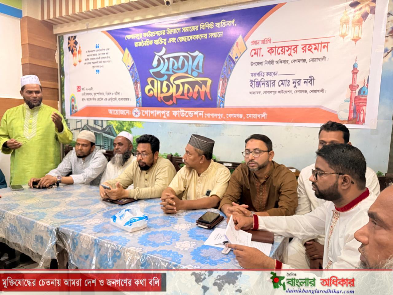 বৃহস্পতিবার বেগমগঞ্জ উপজেলার ২নং গোপালপুর ইউনিয়নের সমাজসেবা সংগঠন “গোপালপুর ফাউন্ডেশনে”র উদ্যোগে বিশিষ্ট ব্যক্তিবর্গ, রাজনৈতিক ব্যক্তিত্ব এবং স্বেচ্ছাসেবকদের সম্মানে এ ইফতার মাহফিল অনুষ্ঠিত হয়।