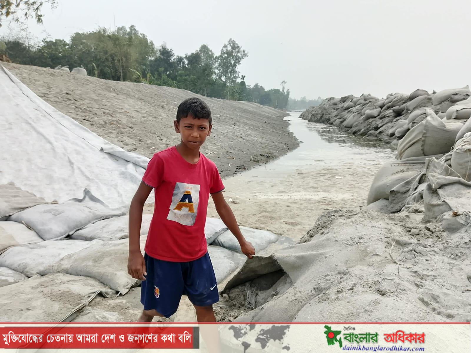 স্থানীয় বালক সিফাত অতি আনন্দের সাথে নদীর কিনারে ডাম্পিং করা জিও ব্যাগের বস্তাগুলো ছিড়াফাটা অংশগুলো খুজে খুজে বের করে সাংবাদিক কে দেখান।