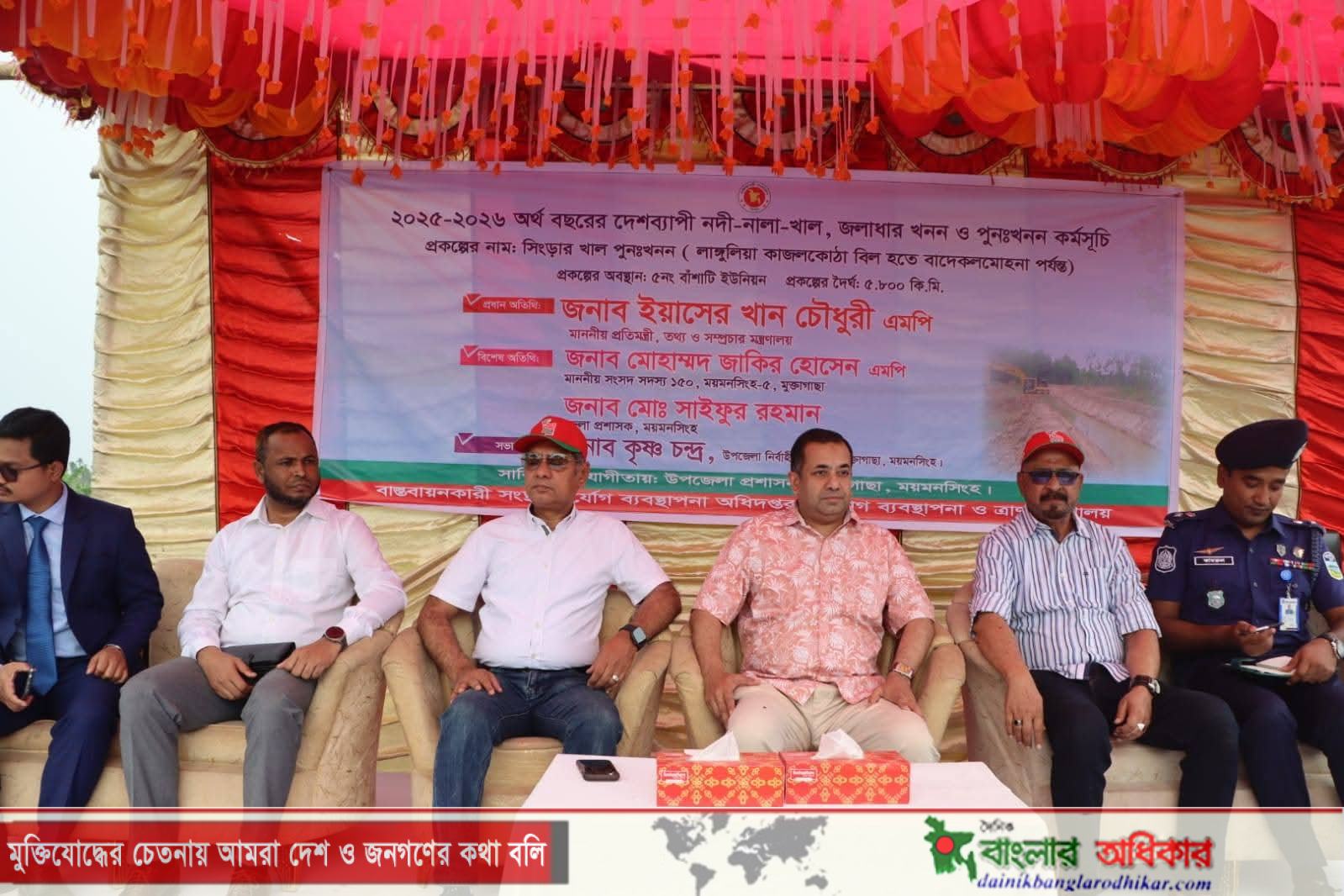 ময়মনসিংহে জেলার মুক্তাগাছা থানার ৫নং বাঁশাটি ইউনিয়নে ২০২৫-২০২৬ অর্থ বছরের দেশব্যাপী নদী-নালা-খাল, জলাধার খনন ও পুনঃখনন কর্মসূচির আওতায় সিংড়ার খাল পুনঃখনন প্রকল্পের উদ্বোধন কার্যক্রমে অনুষ্ঠানে প্রধান অতিথি হিসেবে উপস্থিত ছিলেন বাংলাদেশ সরকারের তথ্য ও সম্প্রচার মন্ত্রণালয়ের প্রতিমন্ত্রী ইয়াসের খান চৌধুরী এমপি।