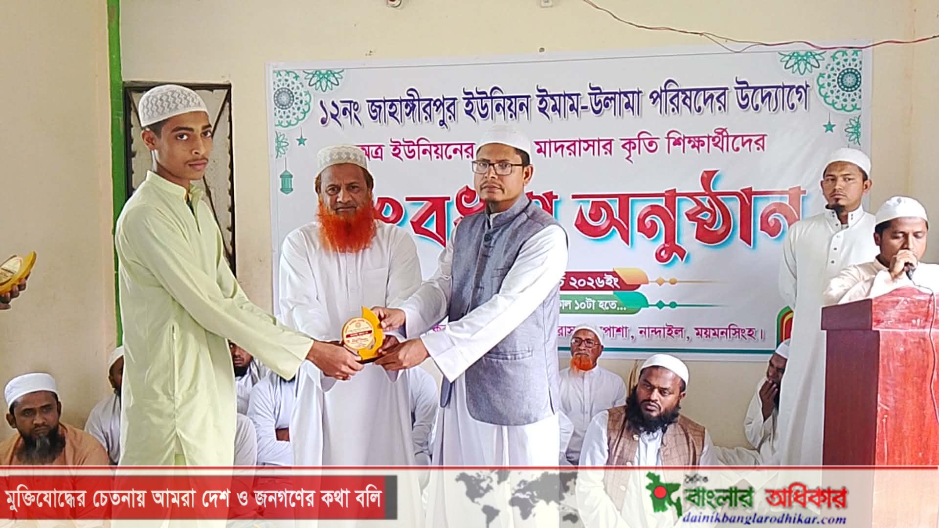 ময়মনসিংহের নান্দাইল উপজেলায় কওমী মাদরাসার কৃতি শিক্ষার্থীদের মেধার স্বীকৃতি ও উৎসাহ প্রদানের লক্ষ্যে এক বিশেষ সংবর্ধনা অনুষ্ঠান অনুষ্ঠিত হয়েছে। সোমবার (২৩ মার্চ) সকালে উপজেলার জাহাঙ্গীরপুর ইউনিয়ন ইমাম-উলামা পরিষদের উদ্যোগে এই অনুষ্ঠানের আয়োজন করা হয়।