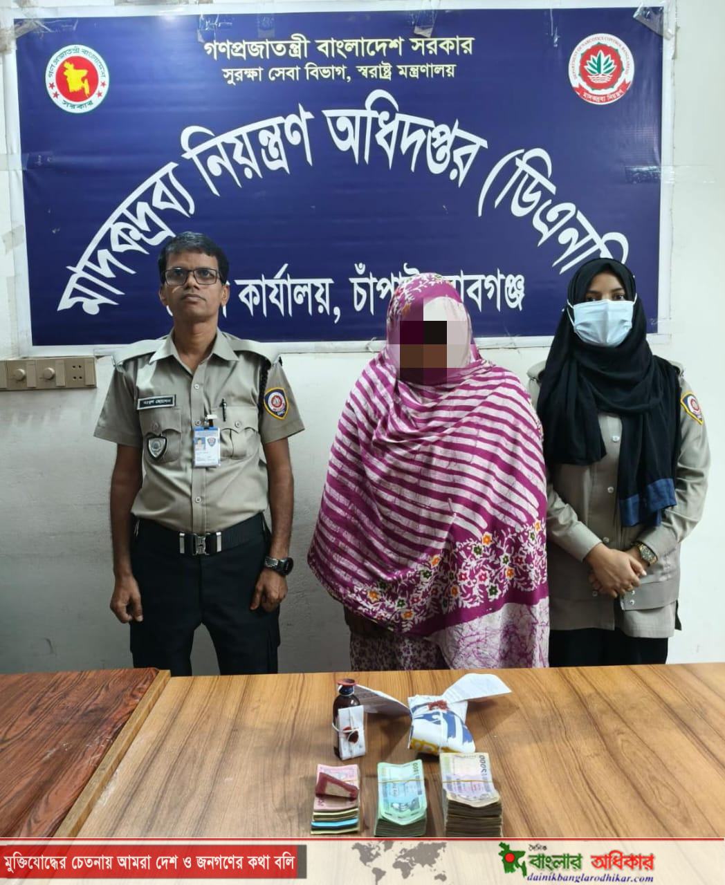 চাঁপাইনবাবগঞ্জ জেলা, শিবগঞ্জ থানাধীন নামোচাকপাড়া গ্রামে মাদকদ্রব্য নিয়ন্ত্রণ অধিদপ্তরের সাম্প্রতিক অভিযানে ৭ গ্রাম হেরোইন, ১০০ পিস ইয়াবা ট্যাবলেট, ২ বোতল কোডিন ফসফেটযুক্ত Eskuf এবং ১,৬৫,৫০০ টাকা নগদ উদ্ধার করা হয়েছে।