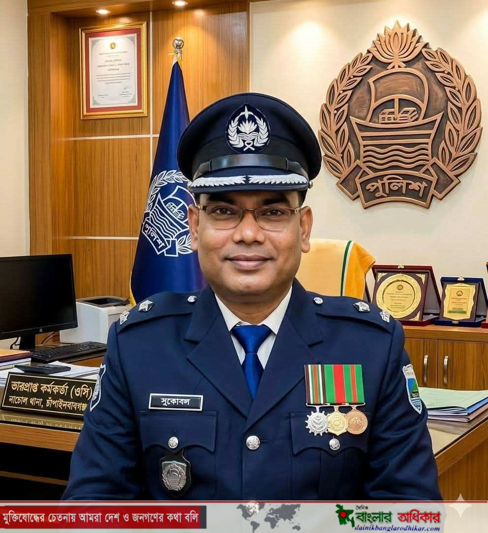 চাঁপাইনবাবগঞ্জ জেলার পুলিশিং সেবায় এক আস্থার নাম সুকোমল চন্দ্র দেবনাথ। সাহসিকতা, সততা আর কর্মনিষ্ঠায় উজ্জ্বল এই পুলিশ কর্মকর্তা এবার নাচোল থানার অফিসার ইনচার্জ (ওসি) হিসেবে দায়িত্ব গ্রহণ করেছেন। তার এই নতুন পথচলাকে ঘিরে উপজেলাজুড়ে যেমন স্বস্তির হাওয়া বইছে, তেমনি অপরাধীদের মধ্যে বিরাজ করছে চরম আতঙ্ক।