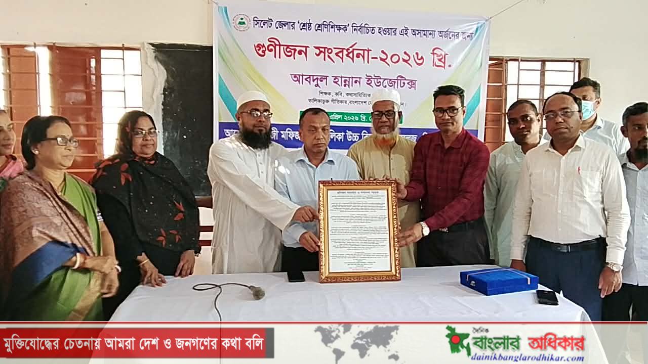 জাতীয় শিক্ষা সপ্তাহ–২০২৬ উপলক্ষে সিলেট জেলার শ্রেষ্ঠ শ্রেণিশিক্ষক নির্বাচিত হওয়ায় কবি আবদুল হান্নান ইউজেটিক্সকে তাঁর কর্মস্থলে জাঁকজমকপূর্ণ সংবর্ধনা প্রদান করা হয়েছে। গত মঙ্গলবার (৭ এপ্রিল) ঐতিহ্যবাহী বিদ্যাপীঠ হাজী মফিজ আলী বালিকা উচ্চ বিদ্যালয় ও কলেজ প্রাঙ্গণে এ অনুষ্ঠানের আয়োজন করা হয়।