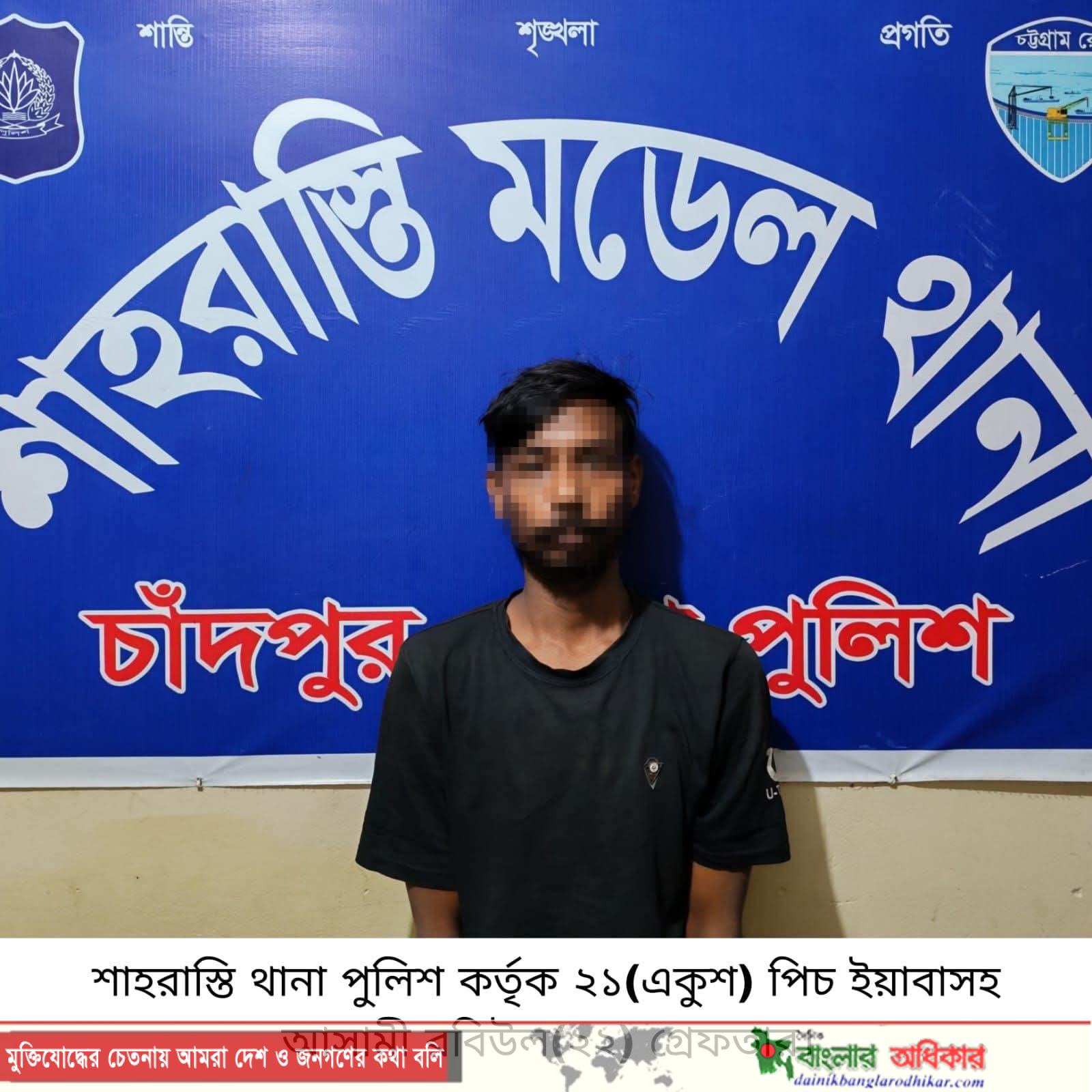 শাহরাস্তি মডেল থানা পুলিশের অভিযানে মাদকদ্রব্য সহ এক জনকে আটক করে পুলিশ। শাহরাস্তি মডেল থানার পুলিশের এর তত্ত্বাবধানে এসআই (নিঃ) মিঠুন দাস, এএসআই (নিঃ) মোঃ শহীদুল্লাহ, এএসআই (নিঃ) মোঃ এরশাদ মিয়া সঙ্গীয় ফোর্সসহ থানার একটি চৌকস টিম মাদক উদ্ধার অভিযান ডিউটি করাকালে ১০/০৪/২০২৬ খ্রিঃ তারিখ শাহরাস্তি থানাধীন টামটা উত্তর ইউপিস্থ ০৬ নং ওয়ার্ড হোসেনপুর সাকিনের কালিয়াপাড়া টু কচুয়া রোডস্থ হোসেনপুর বাজার বিসমিল্লাহ্ মার্কেটের সামনে পাকা রাস্তার উপর অভিযান পরিচালনা করিয়া রবিউল (২২), সাং- হোসেনপুর (হাজী বাড়ী), ০৬ নং ওয়ার্ড, টামটা উত্তর ইউনিয়ন, থানা- শাহরাস্তি, জেলা- চাঁদপুরকে তাহার নিজ হেফাজত হইতে ২১ (একুশ) পিচ ইয়াবা ট্যাবলেটসহ গ্রেফতার করা হয়। পরবর্তীতে ধৃত আসামীর বিরুদ্ধে চাঁদপুর এর শাহরাস্তি মডেল থানার ,এফআইআর নং-৭, তারিখ- ১০ এপ্রিল, ২০২৬; জি আর নং-৭৬, ধারা- ৩৬(১) সারণির ১০(ক) মাদকদ্রব্য নিয়ন্ত্রণ আইন, ২০১৮; রুজু করা হয়। গ্রেফতারকৃত আসামীকে যথাযথ পুলিশ প্রহরার মাধ্যমে বিজ্ঞ আদালতে সোপর্দ করার বিষয়টি প্রক্রিয়াধীন।