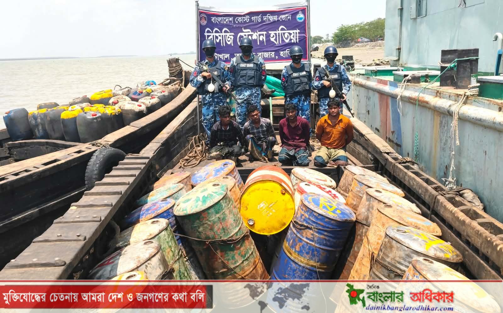 **অভিযান ও জব্দকৃত মালামাল** কোস্ট গার্ড জানায়, গোপন সংবাদের ভিত্তিতে শনিবার ভোর সাড়ে ৬টার দিকে কোস্ট গার্ড স্টেশন হাতিয়া নলচিরা ঘাট সংলগ্ন মেঘনা নদীতে বিশেষ অভিযান পরিচালনা করে। অভিযানকালে একটি বিদেশি তেলবাহী জাহাজ থেকে শুল্ক ফাঁকি দিয়ে আনা ৪ হাজার ৮০০ লিটার পেট্রোল ও ২ হাজার ১৫ লিটার ডিজেলসহ ৪ জনকে হাতেনাতে আটক করা হয়। জব্দকৃত জ্বালানি তেলের আনুমানিক বাজারমূল্য ৭ লক্ষ ৯১ হাজার টাকা। এসময় তেল পরিবহনে ব্যবহৃত দুটি ইঞ্জিনচালিত কাঠের নৌকাও জব্দ করা হয়।