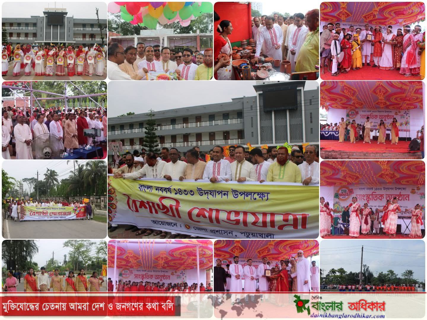 বাঙালির প্রাণের উৎসব বাংলা শুভ নববর্ষ উদ্যাপন উপলক্ষ্যে জেলা প্রশাসন, পটুয়াখালী দিনব্যাপী বর্ণাঢ্য কর্মসূচির আয়োজন করে। দিনের সূচনা হয় জেলা প্রশাসকের কার্যালয় থেকে বের হওয়া এক মনোমুগ্ধকর বৈশাখী শোভাযাত্রার মাধ্যমে, যেখানে আবহমান গ্রাম বাংলার ঐতিহ্য, সংস্কৃতি ও লোকজ জীবনধারা নানা বর্ণিল সাজসজ্জা ও প্রতিকৃতির মাধ্যমে তুলে ধরা হয়।