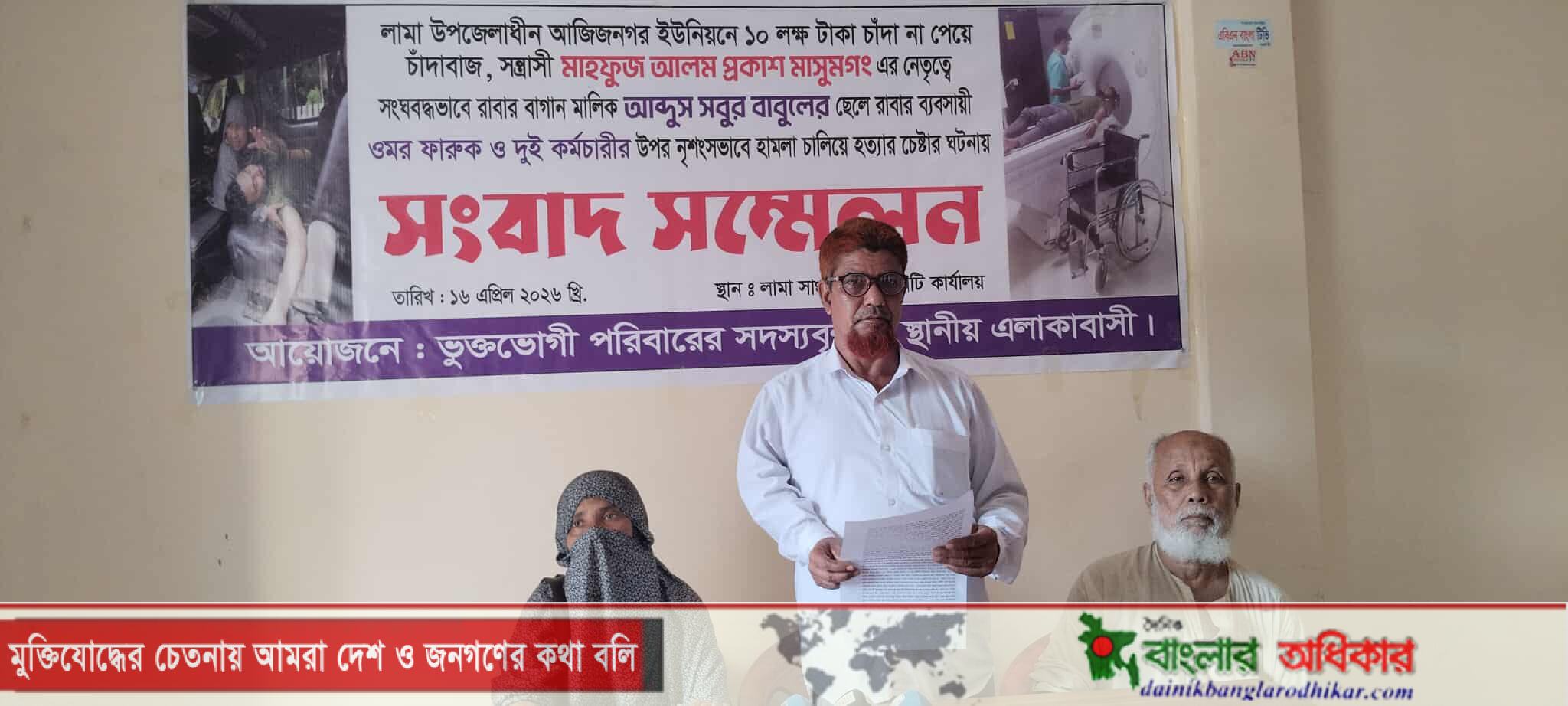 লামায় ১০ লক্ষ টাকা চাঁদা না পেয়ে ব্যবসায়ী ও কর্মচারীদের ওপর নৃশংস হামলা: সংবাদ সম্মেলন